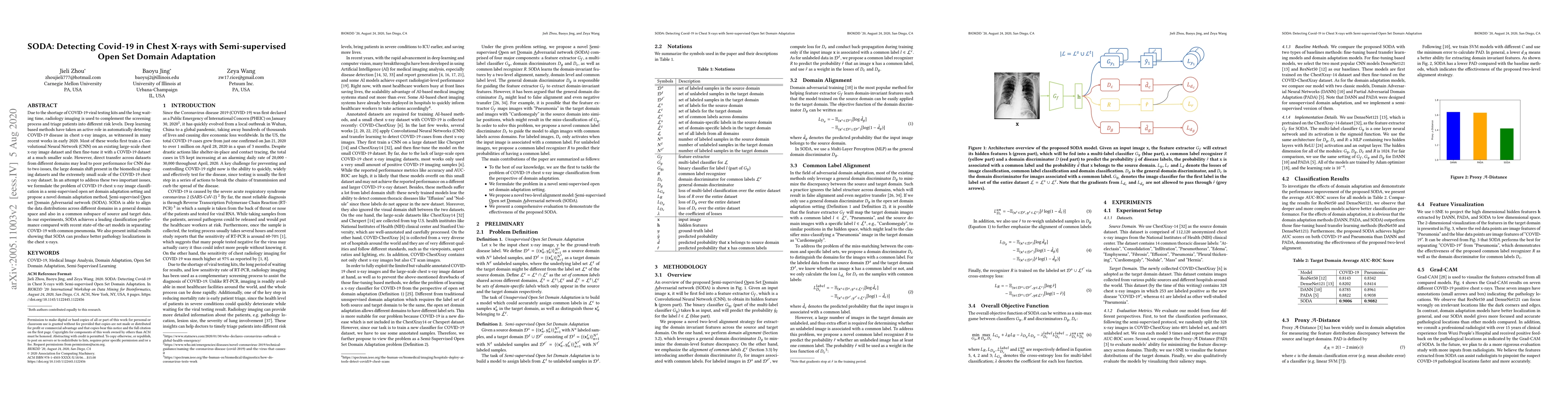 The paper proposes a Semi-supervised Open set Domain Adversarial network (SODA) to address the domain shift and small dataset size issues in detecting COVID-19 from chest x-rays. SODA achieves superior classification performance and better pathology localization compared to state-of-the-art models.