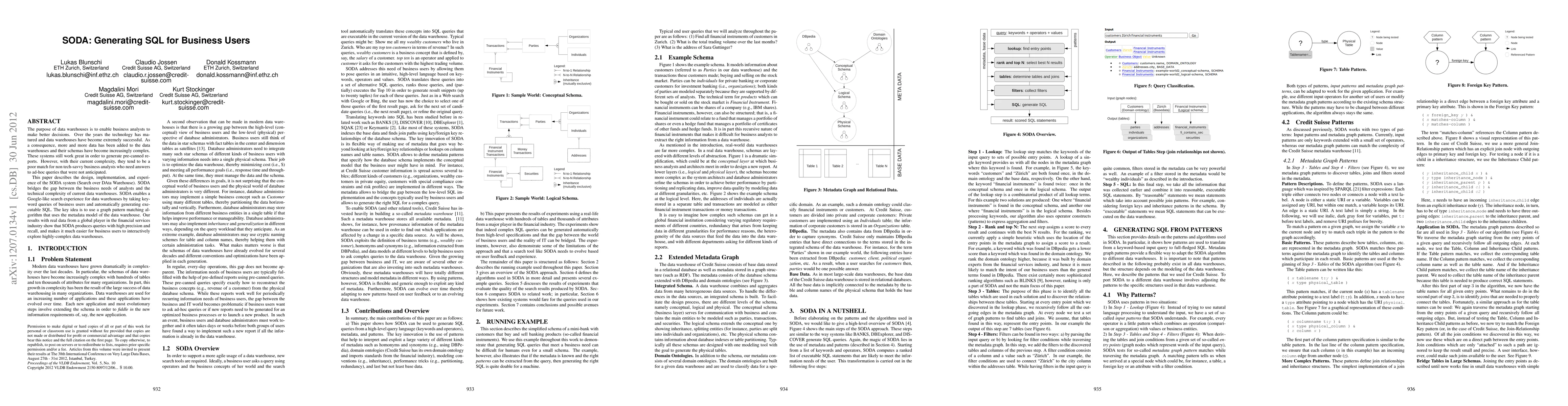 SODA is a system designed to simplify SQL query generation for non-technical business analysts by transforming their keyword queries into executable SQL, leveraging a graph pattern matching algorithm based on data warehouse metadata. Initial results indicate high precision and recall in query generation, enhancing the ability of business users to explore complex data warehouses.