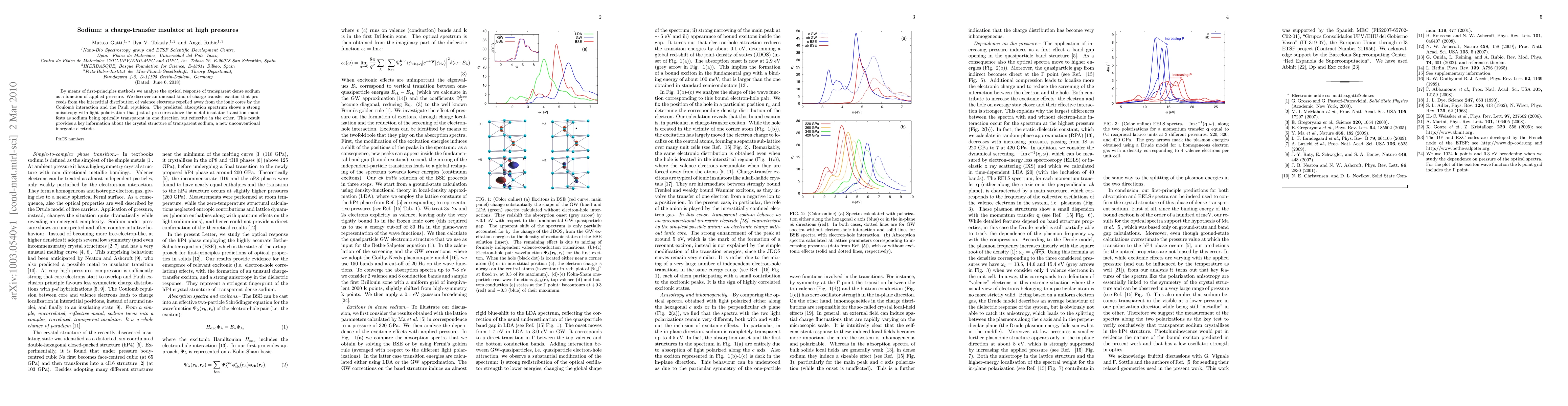 This study reveals that sodium becomes a charge-transfer insulator at high pressures, exhibiting an unusual charge-transfer exciton due to electron repulsion. The optical response shows strong anisotropy, indicating transparency in one direction and reflectivity in another above the metal-insulator transition, highlighting sodium's unique crystal structure as an inorganic electride.