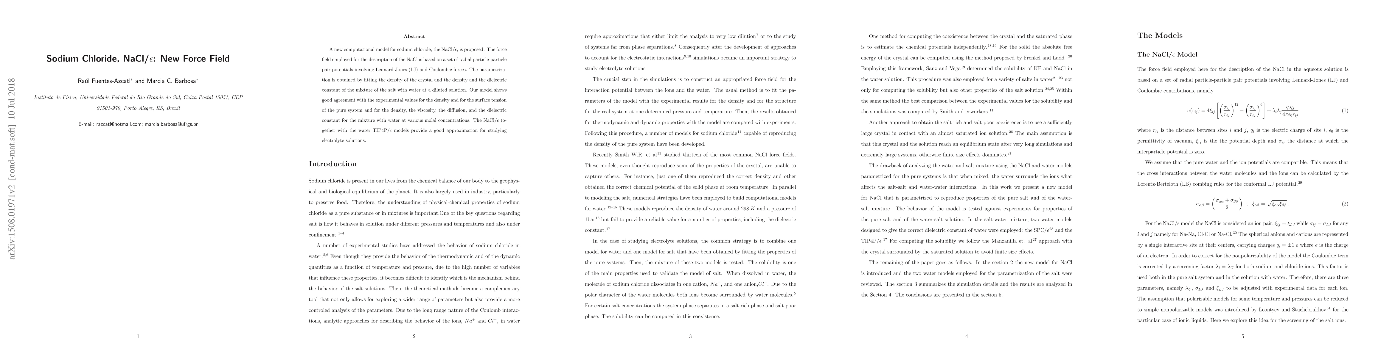 The paper proposes a new computational model, NaCl/{\epsilon}, for sodium chloride based on radial particle-particle pair potentials involving Lennard-Jones and Coulombic forces, showing good agreement with experimental values for various properties in both pure and diluted salt-water solutions. The model, combined with the TIP4P/{\epsilon} water model, provides a reliable approximation for studying electrolyte solutions.