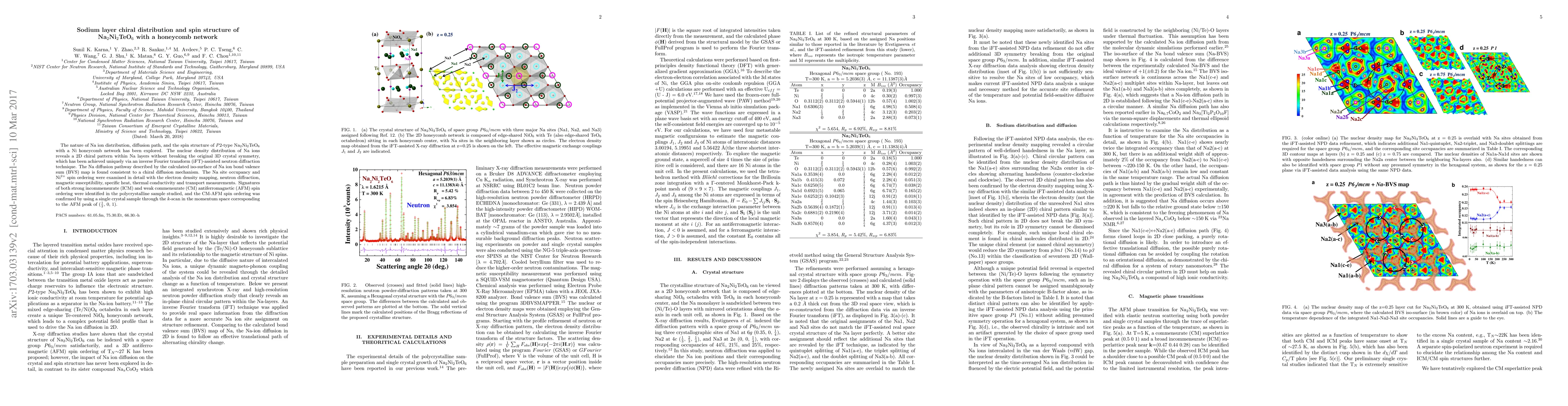 The nature of Na ion distribution, diffusion path, and the spin structure of $P2$-type Na$_2$Ni$_2$TeO$_6$ with a Ni honeycomb network has been explored. The nuclear density distribution of Na ions reveals a 2D chiral pattern within Na layers without breaking the original 3D crystal symmetry, which has been achieved uniquely via an inverse Fourier transform (iFT)-assisted neutron diffraction technique. The Na diffusion pathway described by the calculated iso-surface of Na ion bond valence sum (BVS) map is found consistent to a chiral diffusion mechanism. The Na site occupancy and Ni$^{2+}$ spin ordering were examined in detail with the electron density mapping, neutron diffraction, magnetic susceptibility, specific heat, thermal conductivity and transport measurements. Signatures of both strong incommensurate (ICM) and weak commensurate (CM) antiferromagnetic (AFM) spin ordering were identified in the polycrystalline sample studied, and the CM-AFM spin ordering was confirmed by using a single crystal sample through the $k$-scan in the momentum space corresponding to the AFM peak of ($\frac{1}{2}$, 0, 1).