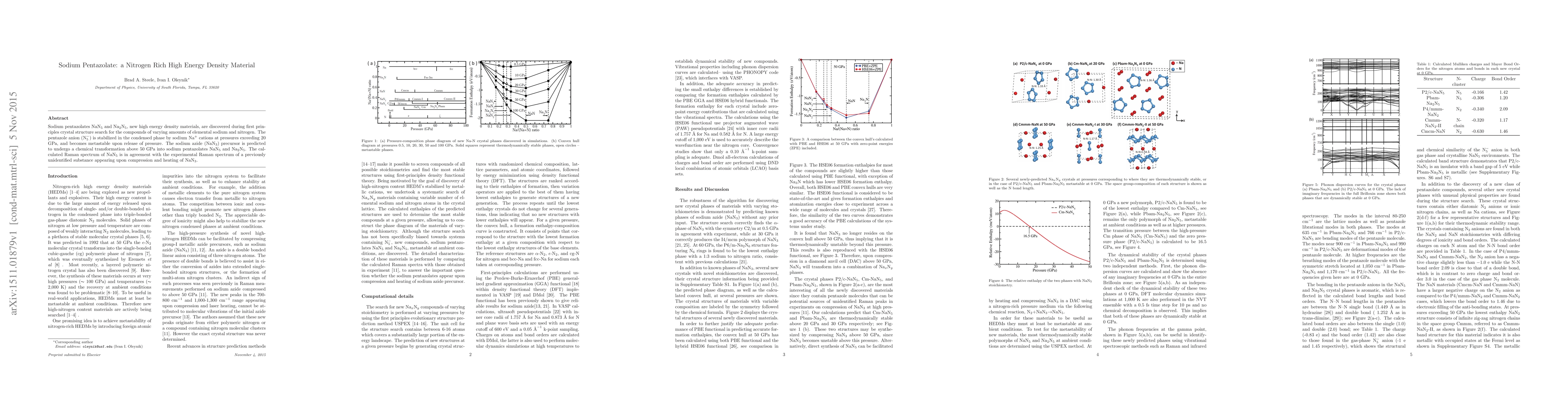 This research identifies new high energy density materials, sodium pentazolates NaN5 and Na2N5, stabilized under high pressure with sodium cations. These were discovered through computational crystal structure searches, confirmed by agreement with experimental Raman spectra data.