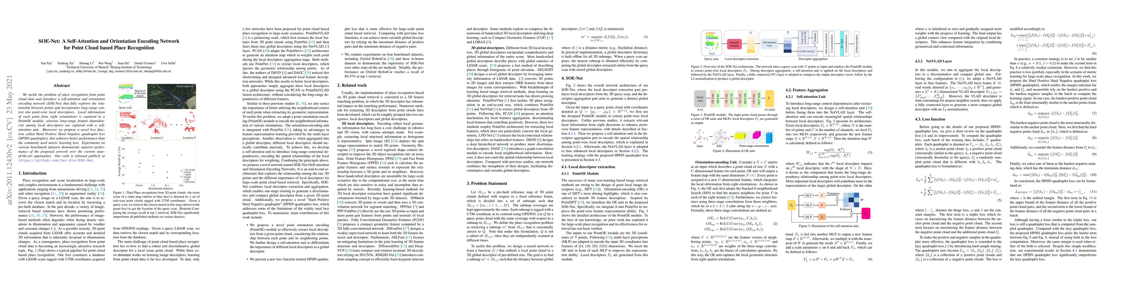 SOE-Net introduces a self-attention and orientation encoding network for point cloud based place recognition, capturing local and long-range features through a PointOE module and self-attention unit, respectively. The proposed Hard Positive Hard Negative quadruplet loss outperforms traditional metric learning losses, achieving state-of-the-art performance on benchmark datasets.