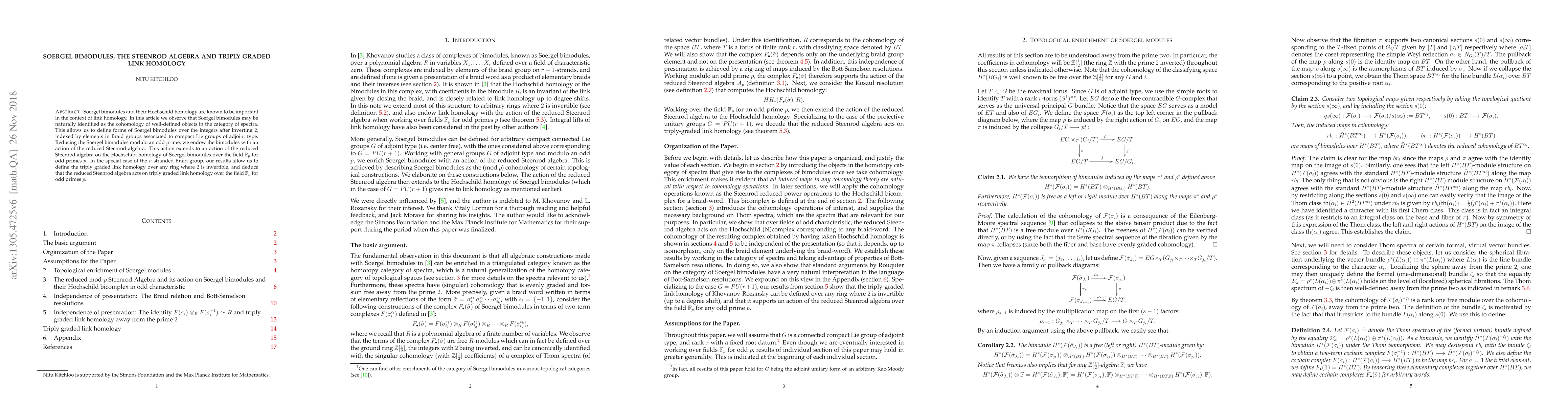 This paper identifies Soergel bimodules as the cohomology of objects in the category of spectra, defining them over integers after inverting 2. It shows these bimodules have an action of the reduced Steenrod algebra, extending to Hochschild homology and triply graded link homology over F_p for odd primes p.