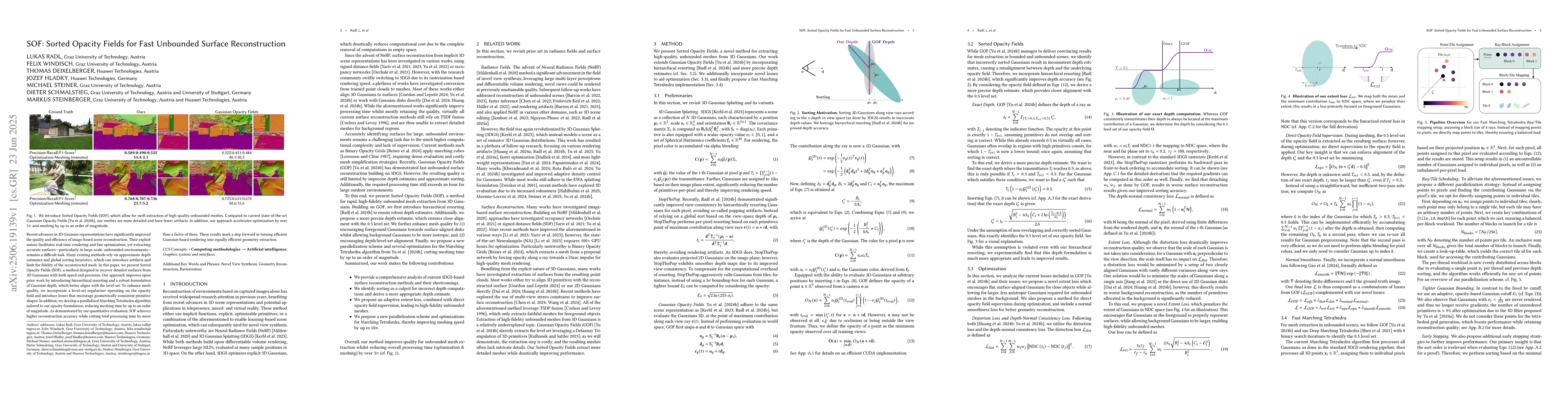 Recent advances in 3D Gaussian representations have significantly improved the quality and efficiency of image-based scene reconstruction. Their explicit nature facilitates real-time rendering and fast optimization, yet extracting accurate surfaces - particularly in large-scale, unbounded environments - remains a difficult task. Many existing methods rely on approximate depth estimates and global sorting heuristics, which can introduce artifacts and limit the fidelity of the reconstructed mesh. In this paper, we present Sorted Opacity Fields (SOF), a method designed to recover detailed surfaces from 3D Gaussians with both speed and precision. Our approach improves upon prior work by introducing hierarchical resorting and a robust formulation of Gaussian depth, which better aligns with the level-set. To enhance mesh quality, we incorporate a level-set regularizer operating on the opacity field and introduce losses that encourage geometrically-consistent primitive shapes. In addition, we develop a parallelized Marching Tetrahedra algorithm tailored to our opacity formulation, reducing meshing time by up to an order of magnitude. As demonstrated by our quantitative evaluation, SOF achieves higher reconstruction accuracy while cutting total processing time by more than a factor of three. These results mark a step forward in turning efficient Gaussian-based rendering into equally efficient geometry extraction.