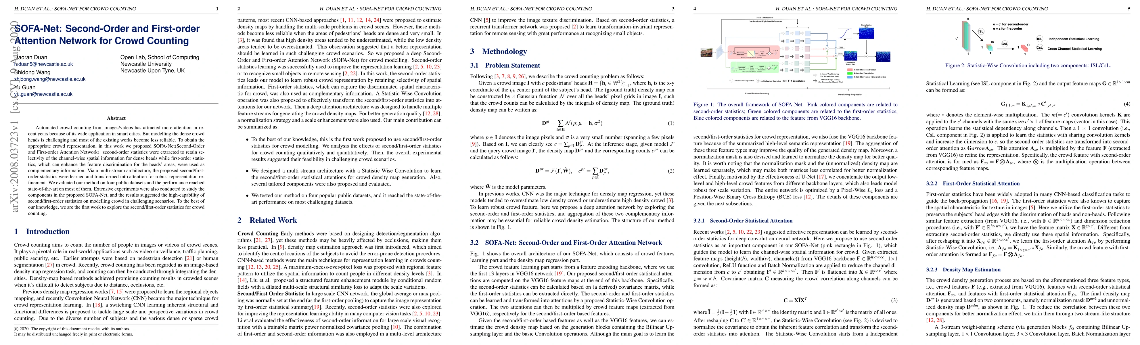 Automated crowd counting from images/videos has attracted more attention in recent years because of its wide application in smart cities. But modelling the dense crowd heads is challenging and most of the existing works become less reliable. To obtain the appropriate crowd representation, in this work we proposed SOFA-Net(Second-Order and First-order Attention Network): second-order statistics were extracted to retain selectivity of the channel-wise spatial information for dense heads while first-order statistics, which can enhance the feature discrimination for the heads' areas, were used as complementary information. Via a multi-stream architecture, the proposed second/first-order statistics were learned and transformed into attention for robust representation refinement. We evaluated our method on four public datasets and the performance reached state-of-the-art on most of them. Extensive experiments were also conducted to study the components in the proposed SOFA-Net, and the results suggested the high-capability of second/first-order statistics on modelling crowd in challenging scenarios. To the best of our knowledge, we are the first work to explore the second/first-order statistics for crowd counting.