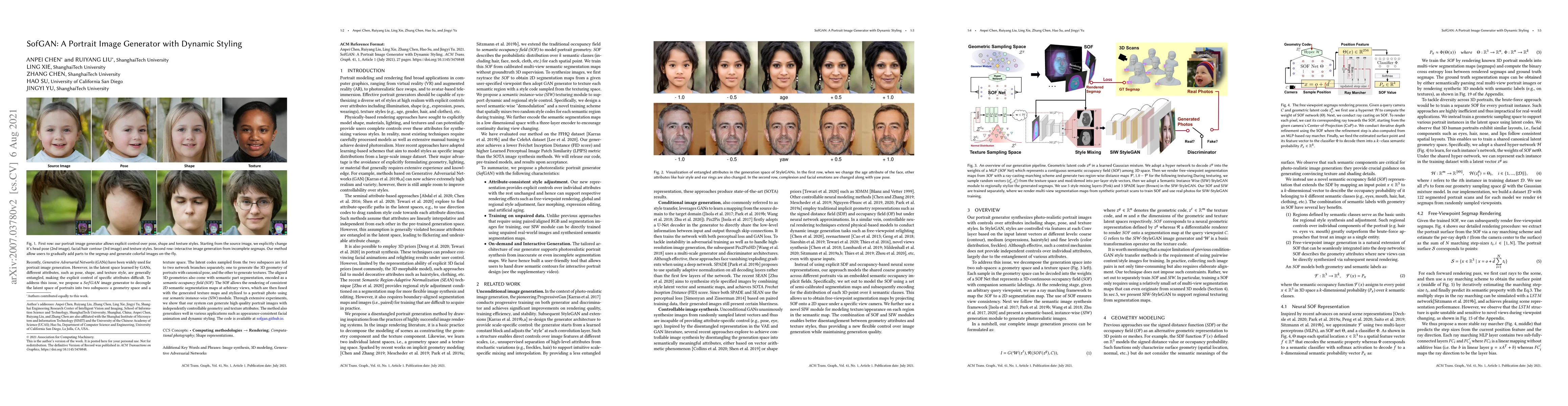 Recently, Generative Adversarial Networks (GANs)} have been widely used for portrait image generation. However, in the latent space learned by GANs, different attributes, such as pose, shape, and texture style, are generally entangled, making the explicit control of specific attributes difficult. To address this issue, we propose a SofGAN image generator to decouple the latent space of portraits into two subspaces: a geometry space and a texture space. The latent codes sampled from the two subspaces are fed to two network branches separately, one to generate the 3D geometry of portraits with canonical pose, and the other to generate textures. The aligned 3D geometries also come with semantic part segmentation, encoded as a semantic occupancy field (SOF). The SOF allows the rendering of consistent 2D semantic segmentation maps at arbitrary views, which are then fused with the generated texture maps and stylized to a portrait photo using our semantic instance-wise (SIW) module. Through extensive experiments, we show that our system can generate high quality portrait images with independently controllable geometry and texture attributes. The method also generalizes well in various applications such as appearance-consistent facial animation and dynamic styling.
