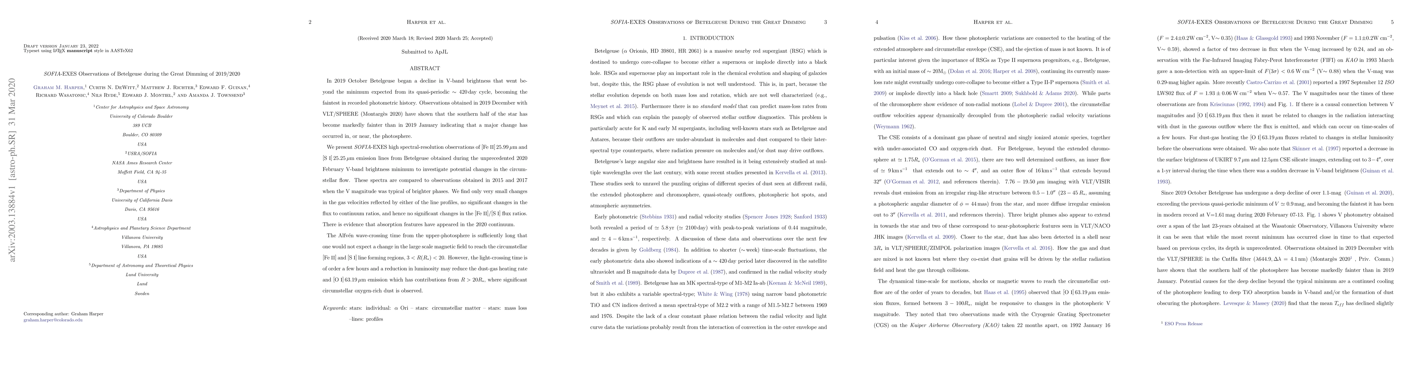 In 2019 October Betelgeuse began a decline in V-band brightness that went beyond the minimum expected from its quasi-periodic ~420 day cycle, becoming the faintest in recorded photometric history. Observations obtained in 2019 December with VLT/SPHERE (Montarges 2020) have shown that the southern half of the star has become markedly fainter than in 2019 January indicating that a major change has occurred in, or near, the photosphere. We present SOFIA-EXES high spectral-resolution observations of [Fe II] 25.99 mic and [S I] 25.25 mic emission lines from Betelgeuse obtained during the unprecedented 2020 February V-band brightness minimum to investigate potential changes in the circumstellar flow. These spectra are compared to observations obtained in 2015 and 2017 when the V magnitude was typical of brighter phases. We find only very small changes in the gas velocities reflected by either of the line profiles, no significant changes in the flux to continuum ratios, and hence no significant changes in the [Fe II]/[S I] flux ratios. There is evidence that absorption features have appeared in the 2020 continuum. The Alfven wave-crossing time from the upper-photosphere is sufficiently long that one would not expect a change in the large scale magnetic field to reach the circumstellar [Fe II] and [S I] line forming regions, 3 < R(R*) < 20. However, the light-crossing time is of order a few hours and a reduction in luminosity may reduce the dust-gas heating rate and [O I] 63.19 mic emission which has contributions from R > 20R*, where significant circumstellar oxygen-rich dust is observed.