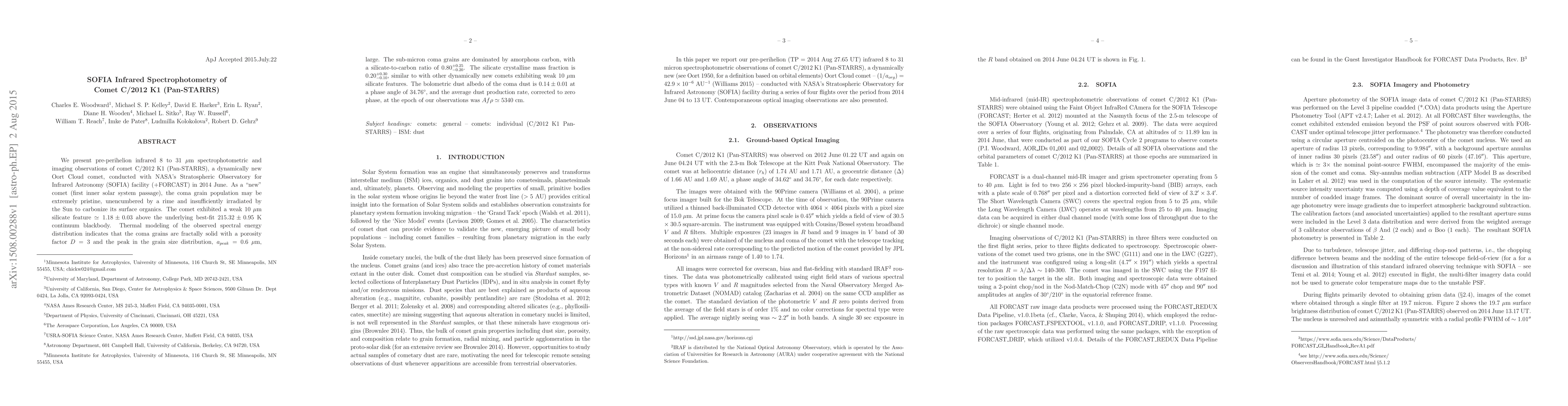 Astronomers studied comet C/2012 K1 (Pan-STARRS) using NASA's SOFIA facility, finding pristine coma grains dominated by amorphous carbon with a silicate-to-carbon ratio of 0.80, similar to other dynamically new comets.