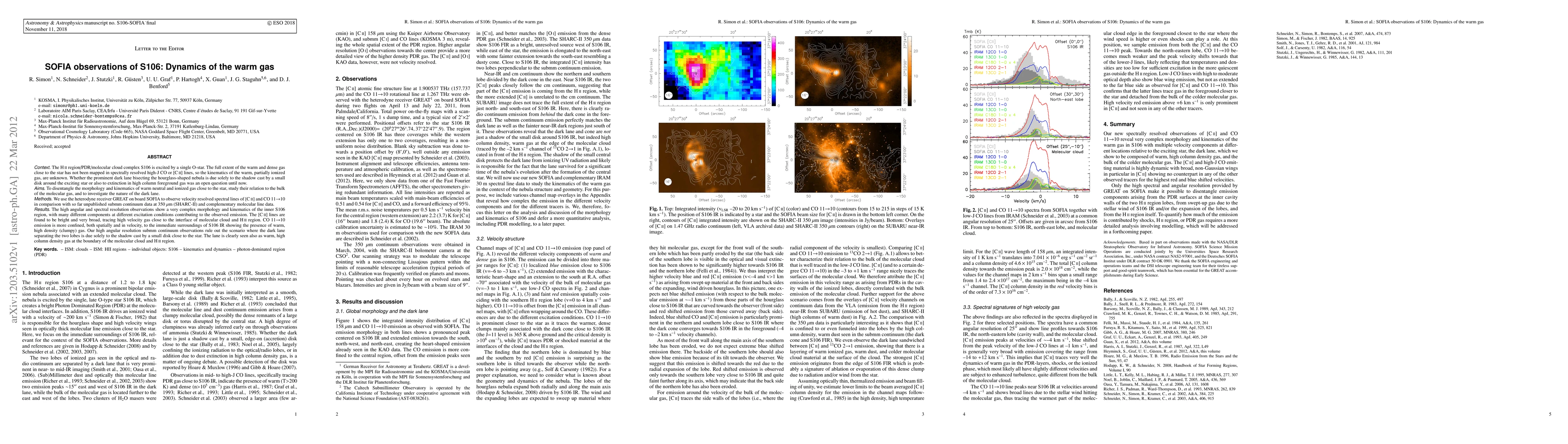 Context. The HII region/PDR/molecular cloud complex S106 is excited by a single O-star. The full extent of the warm and dense gas close to the star has not been mapped in spectrally resolved high-J CO or [CII] lines, so the kinematics of the warm, partially ionized gas, are unknown. Whether the prominent dark lane bisecting the hourglass-shaped nebula is due solely to the shadow cast by a small disk around the exciting star or also to extinction in high column foreground gas was an open question until now. Aims. To disentangle the morphology and kinematics of warm neutral and ionized gas close to the star, study their relation to the bulk of the molecular gas, and to investigate the nature of the dark lane. Methods. We use the heterodyne receiver GREAT on board SOFIA to observe velocity resolved spectral lines of [C II] and CO 11-10 in comparison with so far unpublished submm continuum data at 350 micron (SHARC-II) and complementary molecular line data. Results. The high angular and spectral resolution observations show a very complex morphology and kinematics of the inner S106 region, with many different components at different excitation conditions contributing to the observed emission. The [C II] lines are found to be bright and very broad, tracing high velocity gas close to the interface of molecular cloud and HII region. CO 11-10 emission is more confined, both spatially and in velocity, to the immediate surroundings of S106 IR showing the presence of warm, high density (clumpy) gas. Our high angular resolution submm continuum observations rule out the scenario where the dark lane separating the two lobes is due solely to the shadow cast by a small disk close to the star. The lane is clearly seen also as warm, high column density gas at the boundary of the molecular cloud and HII region.