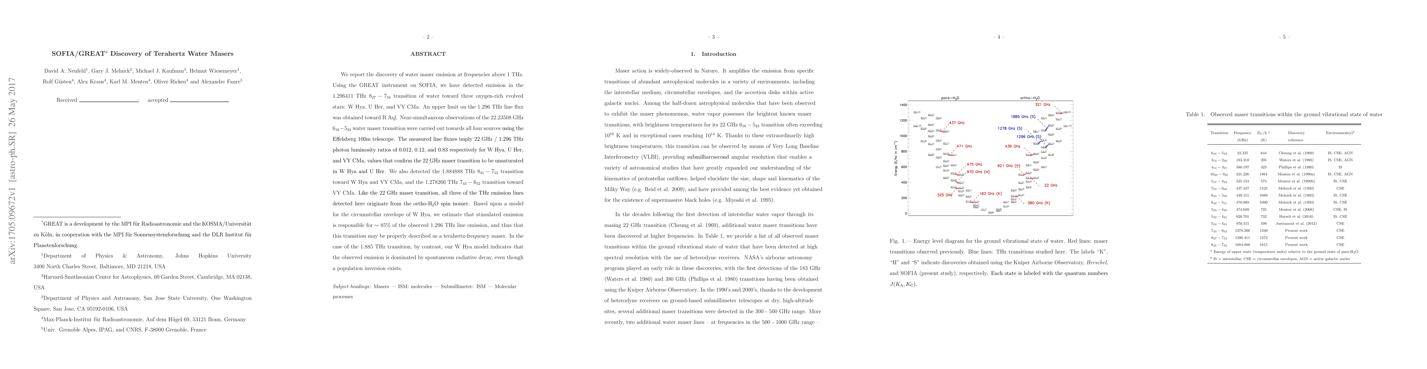 We report the discovery of water maser emission at frequencies above 1 THz. Using the GREAT instrument on SOFIA, we have detected emission in the 1.296411 THz 8(27)-7(34) transition of water toward three oxygen-rich evolved stars: W Hya, U Her, and VY CMa. An upper limit on the 1.296 THz line flux was obtained toward R Aql. Near-simultaneous observations of the 22.23508 GHz 6(16)-5(23) water maser transition were carried out towards all four sources using the Effelsberg 100m telescope. The measured line fluxes imply 22 GHz / 1.296 THz photon luminosity ratios of 0.012, 0.12, and 0.83 respectively for W Hya, U Her, and VY CMa, values that confirm the 22 GHz maser transition to be unsaturated in W Hya and U Her. We also detected the 1.884888 THz 8(45)-7(53) transition toward W Hya and VY CMa, and the 1.278266 THz 7(43)-6(52) transition toward VY CMa. Like the 22 GHz maser transition, all three of the THz emission lines detected here originate from the ortho-H2O spin isomer. Based upon a model for the circumstellar envelope of W Hya, we estimate that stimulated emission is responsible for ~ 85% of the observed 1.296 THz line emission, and thus that this transition may be properly described as a terahertz-frequency maser. In the case of the 1.885 THz transition, by contrast, our W Hya model indicates that the observed emission is dominated by spontaneous radiative decay, even though a population inversion exists.