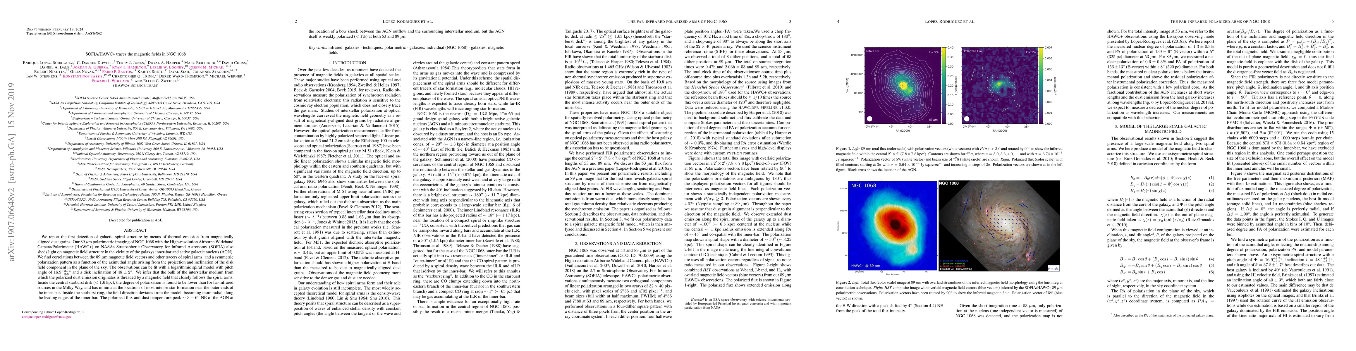 SOFIA/HAWC+ detects the first galactic spiral structure via thermal emission from magnetically aligned dust grains in NGC 1068, revealing a magnetic field closely following the spiral arms and a logarithmic spiral model with a pitch angle of $16.9^{+2.7}_{-2.8}^{\circ}$. The AGN outflow creates a bow shock NE of the nucleus, peaking polarized flux and dust temperature.