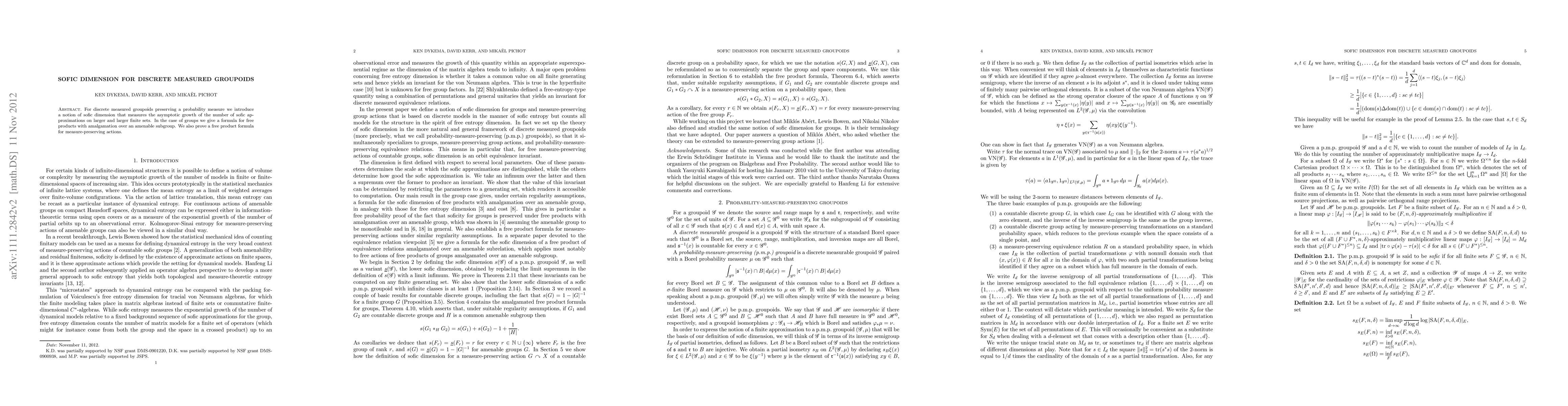 This paper introduces a concept of sofic dimension for discrete measured groupoids, measuring the asymptotic growth of sofic approximations. It provides a formula for sofic dimension in the context of free products with amalgamation over amenable subgroups and proves a similar formula for measure-preserving actions.