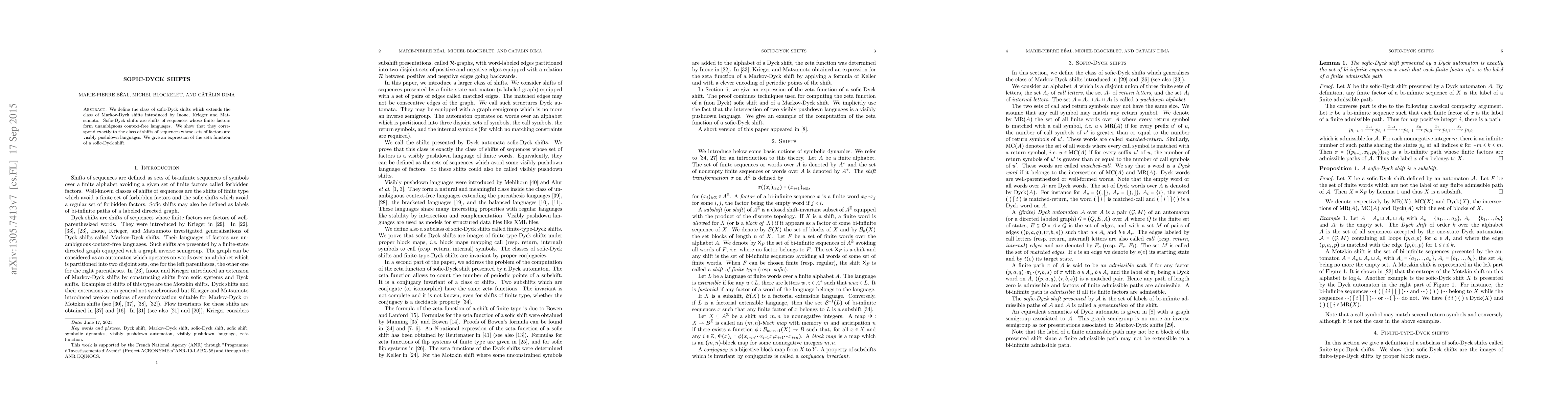 Summary: This paper introduces sofic-Dyck shifts, an extension of Markov-Dyck shifts, characterized by their finite factors forming unambiguous context-free languages. The authors demonstrate their equivalence to shifts with visibly pushdown languages and present an expression for their zeta function.