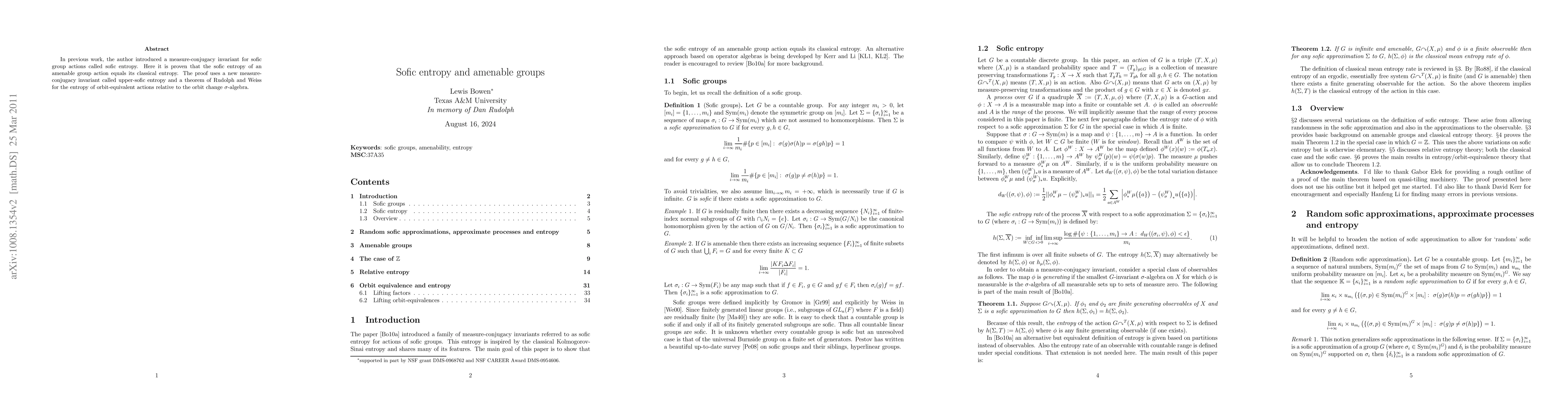 The introduction of upper-sofic entropy as a measure-conjugacy invariant and its application in proving the equality of sofic and classical entropy for amenable group actions.