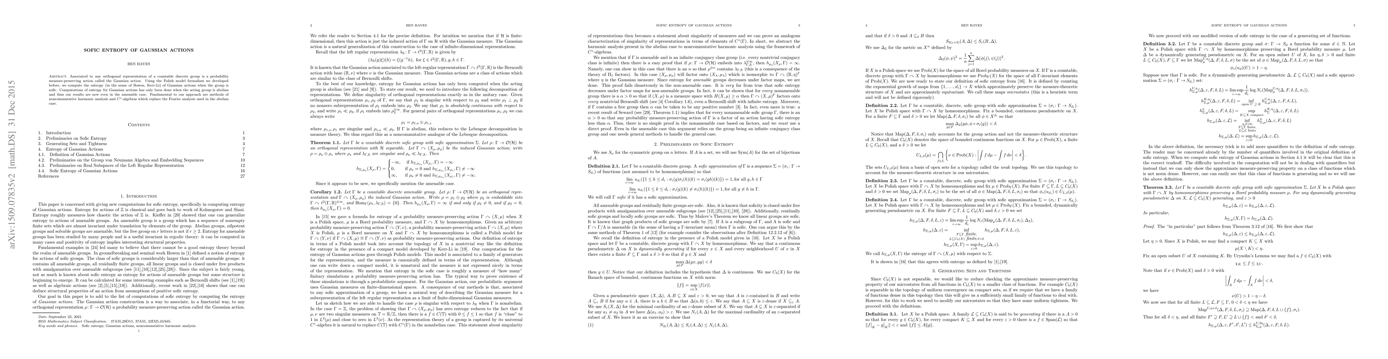 Associated to any orthogonal representation of a countable discrete group is an probability measure-preserving action called the Gaussian action. Using the Polish model formalism we developed before, we compute the entropy (in the sense of Bowen, Kerr-Li) of Gaussian actions when the group is sofic. Computations of entropy for Gaussian actions has only been done when the acting group is abelian and thus our results are new even in the amenable case. Fundamental to our approach are methods of noncommutative harmonic analysis and $C^{*}$-algebras which replace the Fourier analysis used in the abelian case.