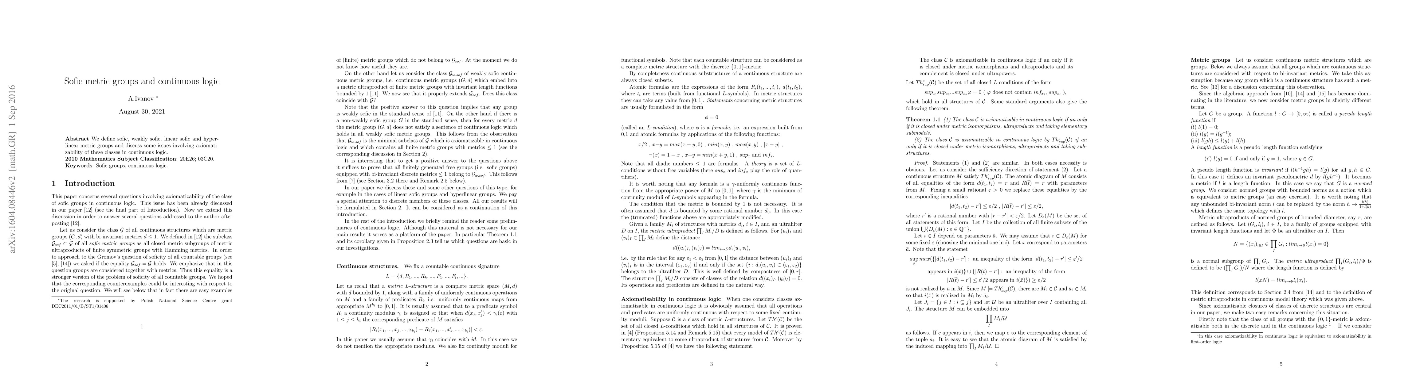 This paper introduces various types of sofic metric groups and explores their axiomatizability within the framework of continuous logic, focusing on the distinctions between sofic, weakly sofic, linear sofic, and hyperlinear metric groups.
