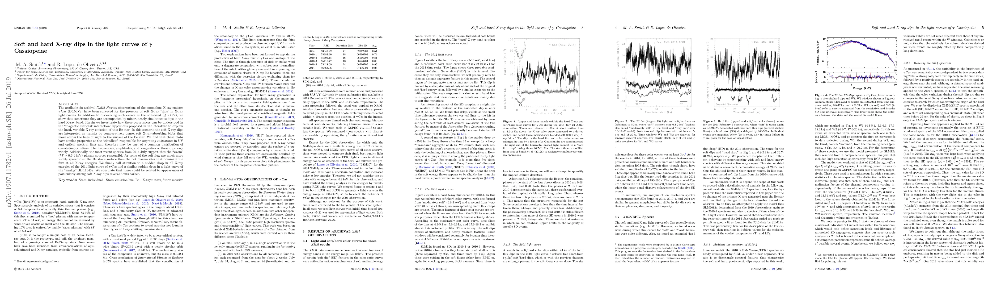 Researchers observed soft X-ray dips in the light curves of gamma Cassiopeiae, finding them accompanied by minor hard X-ray dips, which may indicate dense X-ray-absorbing blobs moving across sightlines to the Be star.
