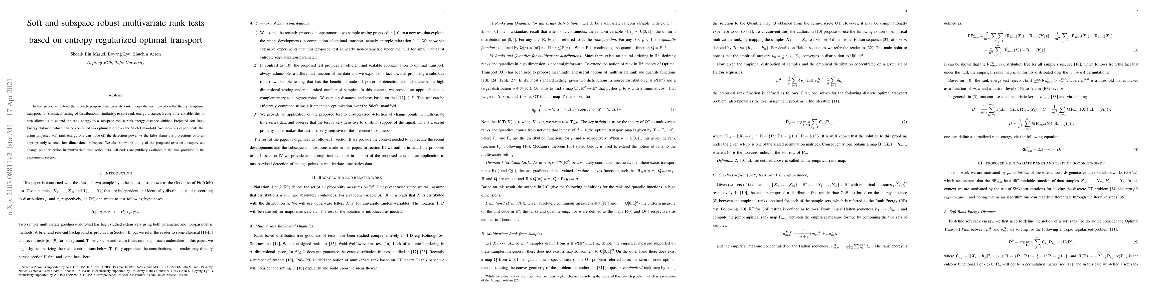 This paper introduces a differentiable, soft rank energy distance based on optimal transport for statistical testing of distributional similarity. It extends this to a subspace robust rank energy distance, enabling trade-offs between detection power and false alarms via low-dimensional projections, and demonstrates its utility in unsupervised change point detection in multivariate time series data.