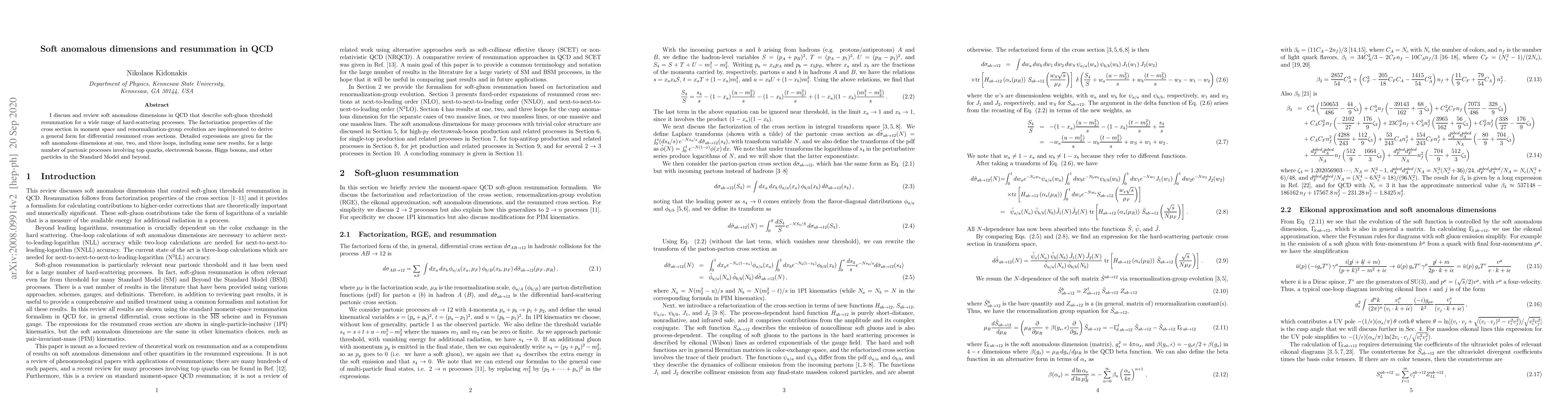 I discuss and review soft anomalous dimensions in QCD that describe soft-gluon threshold resummation for a wide range of hard-scattering processes. The factorization properties of the cross section in moment space and renormalization-group evolution are implemented to derive a general form for differential resummed cross sections. Detailed expressions are given for the soft anomalous dimensions at one, two, and three loops, including some new results, for a large number of partonic processes involving top quarks, electroweak bosons, Higgs bosons, and other particles in the Standard Model and beyond.
