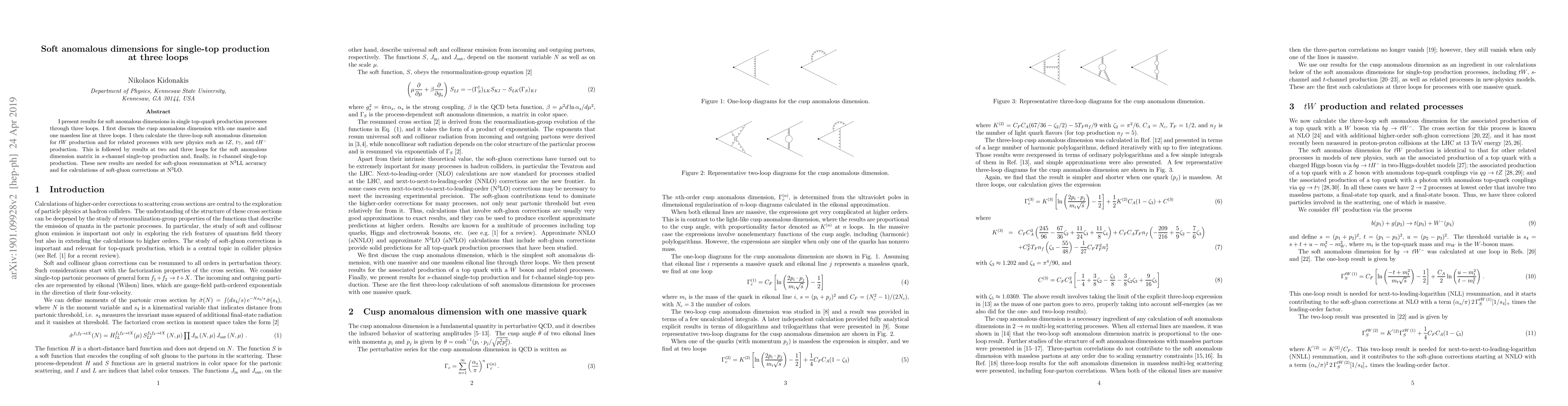 I present results for soft anomalous dimensions in single top-quark production processes through three loops. I first discuss the cusp anomalous dimension with one massive and one massless line at three loops. I then calculate the three-loop soft anomalous dimension for $tW$ production and for related processes with new physics such as $tZ$, $t\gamma$, and $tH^-$ production. This is followed by results at two and three loops for the soft anomalous dimension matrix in $s$-channel single-top production and, finally, in $t$-channel single-top production. These new results are needed for soft-gluon resummation at N$^3$LL accuracy and for calculations of soft-gluon corrections at N$^3$LO.