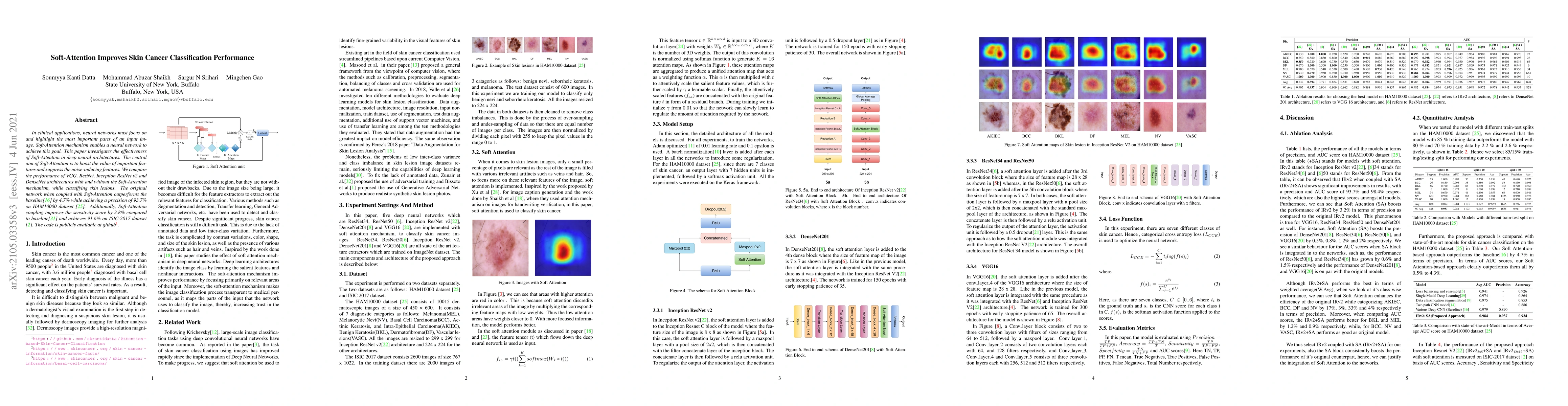In clinical applications, neural networks must focus on and highlight the most important parts of an input image. Soft-Attention mechanism enables a neural network toachieve this goal. This paper investigates the effectiveness of Soft-Attention in deep neural architectures. The central aim of Soft-Attention is to boost the value of important features and suppress the noise-inducing features. We compare the performance of VGG, ResNet, InceptionResNetv2 and DenseNet architectures with and without the Soft-Attention mechanism, while classifying skin lesions. The original network when coupled with Soft-Attention outperforms the baseline[16] by 4.7% while achieving a precision of 93.7% on HAM10000 dataset [25]. Additionally, Soft-Attention coupling improves the sensitivity score by 3.8% compared to baseline[31] and achieves 91.6% on ISIC-2017 dataset [2]. The code is publicly available at github.