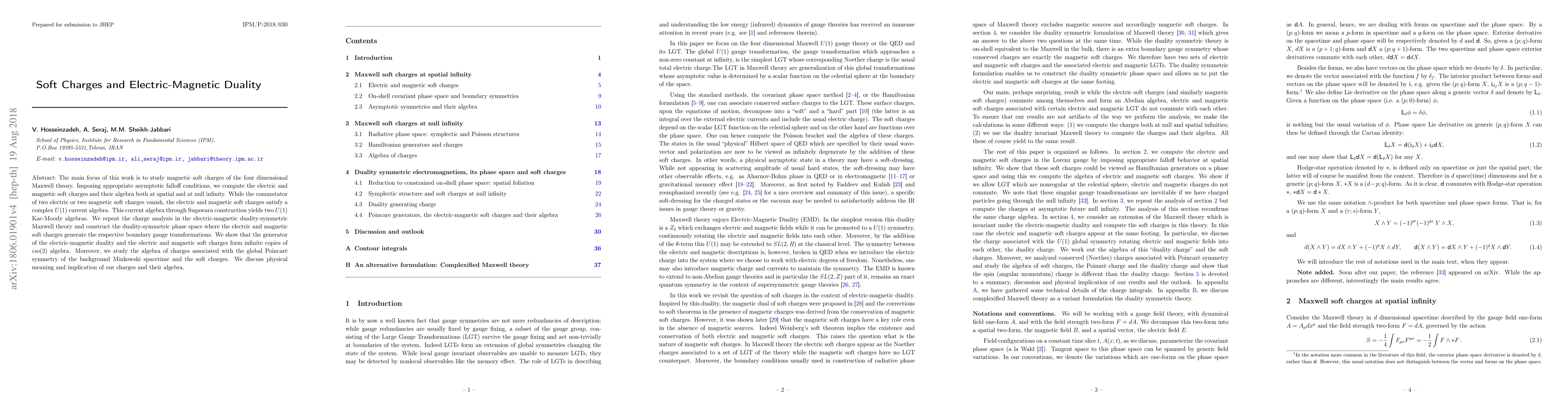 This research examines magnetic soft charges in four-dimensional Maxwell theory, discovering a complex $U(1)$ current algebra and two $U(1)$ Kac-Moody algebras via Sugawara construction. It also explores electric-magnetic duality, revealing infinite copies of $iso(2)$ algebra, and discusses the implications of these findings on physical theories.