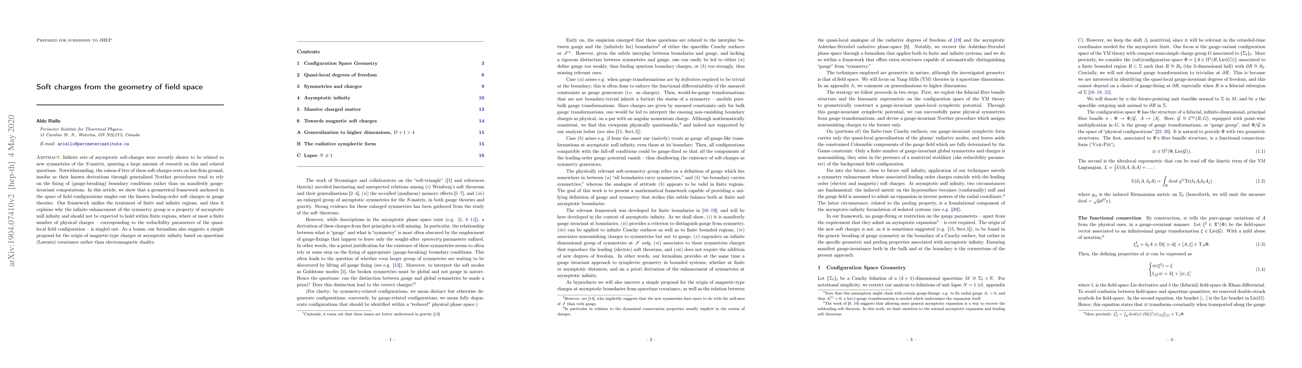 Infinite sets of asymptotic soft-charges were recently shown to be related to new symmetries of the $S$-matrix, spurring a large amount of research on this and related questions. Notwithstanding, the raison-d'\^etre of these soft-charges rests on less firm ground, insofar as their known derivations through generalized Noether procedures tend to rely on the fixing of (gauge-breaking) boundary conditions rather than on manifestly gauge-invariant computations. In this article, we show that a geometrical framework anchored in the space of field configurations singles out the known leading-order soft charges in gauge theories. Our framework unifies the treatment of finite and infinite regions, and thus it explains why the infinite enhancement of the symmetry group is a property of asymptotic null infinity and should not be expected to hold within finite regions, where at most a finite number of physical charges -- corresponding to the reducibility parameters of the quasi-local field configuration -- is singled out. As a bonus, our formalism also suggests a simple proposal for the origin of magnetic-type charges at asymptotic infinity based on spacetime (Lorentz) covariance rather than electromagnetic duality.