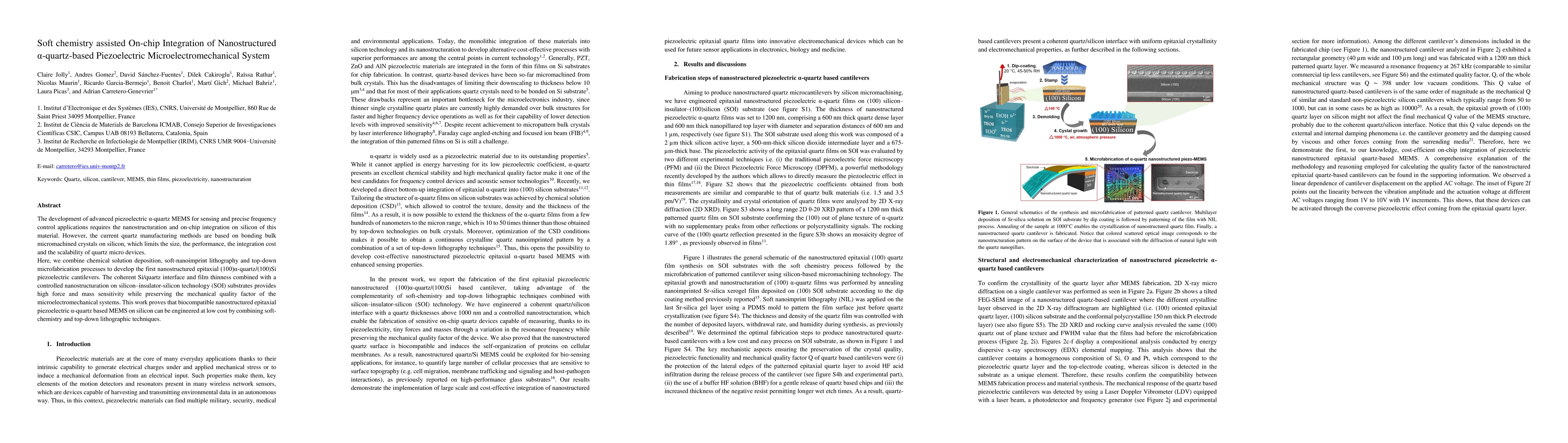 This paper presents a novel method for integrating nanostructured quartz-based piezoelectric MEMS on silicon using soft chemistry and nanoimprint lithography, achieving high sensitivity and mechanical quality factors while reducing costs and improving scalability. The approach combines chemical solution deposition and top-down microfabrication to create biocompatible, high-performance devices.