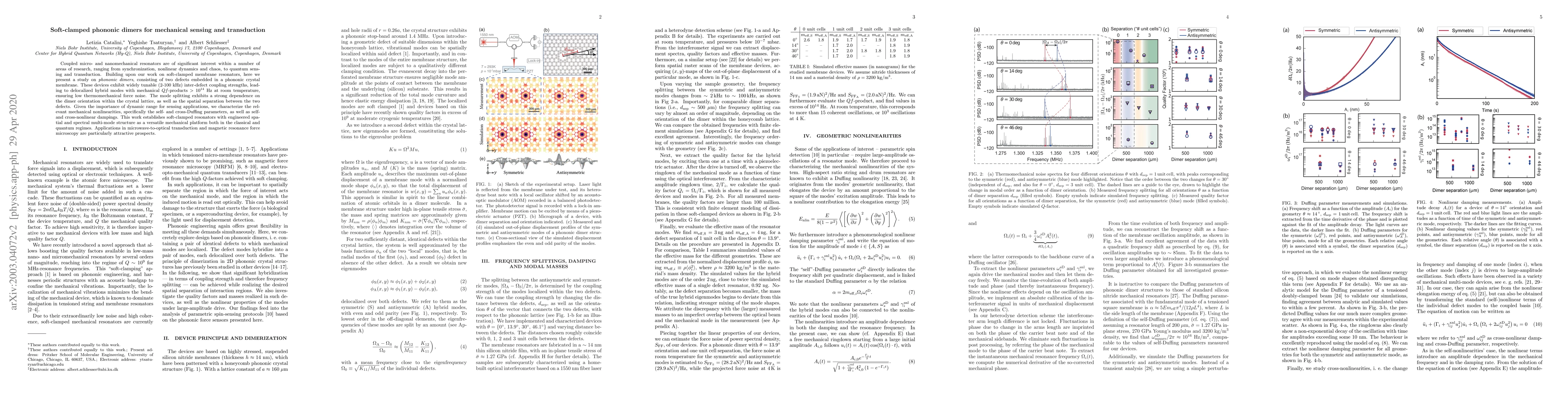 This paper investigates phononic dimers composed of two defects in a phononic crystal membrane, demonstrating tunable inter-defect coupling and high mechanical Q-factors. The study highlights the potential for these soft-clamped resonators in mechanical sensing and transduction, with applications in quantum sensing and microwave-to-optical conversion.