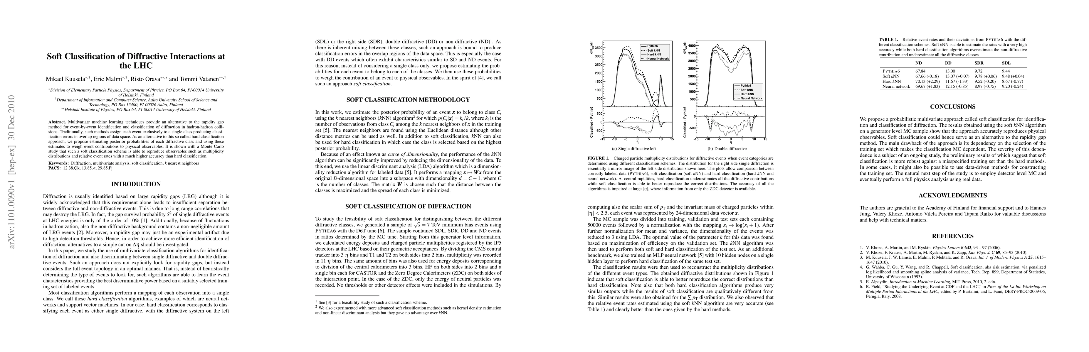 This paper proposes a soft classification method using multivariate machine learning to identify and classify diffractive interactions in hadron-hadron collisions at the LHC, offering a more accurate alternative to traditional hard classification by estimating posterior probabilities for each diffractive class. The method demonstrates superior accuracy in reproducing physical observables compared to hard classification.