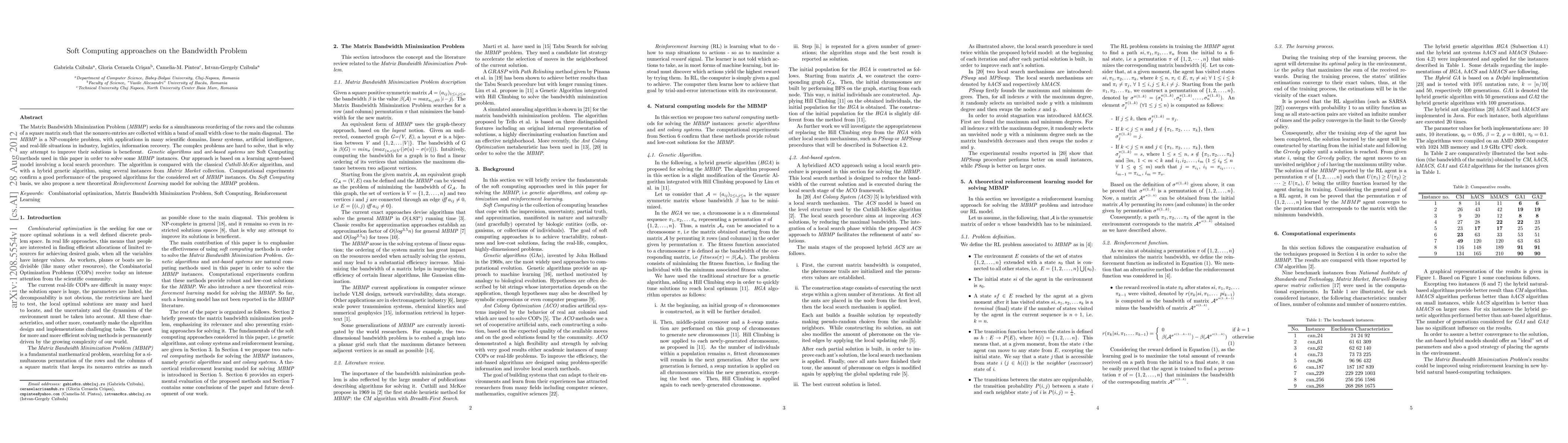 The Matrix Bandwidth Minimization Problem (MBMP) seeks for a simultaneous reordering of the rows and the columns of a square matrix such that the nonzero entries are collected within a band of small width close to the main diagonal. The MBMP is a NP-complete problem, with applications in many scientific domains, linear systems, artificial intelligence, and real-life situations in industry, logistics, information recovery. The complex problems are hard to solve, that is why any attempt to improve their solutions is beneficent. Genetic algorithms and ant-based systems are Soft Computing methods used in this paper in order to solve some MBMP instances. Our approach is based on a learning agent-based model involving a local search procedure. The algorithm is compared with the classical Cuthill-McKee algorithm, and with a hybrid genetic algorithm, using several instances from Matrix Market collection. Computational experiments confirm a good performance of the proposed algorithms for the considered set of MBMP instances. On Soft Computing basis, we also propose a new theoretical Reinforcement Learning model for solving the MBMP problem.