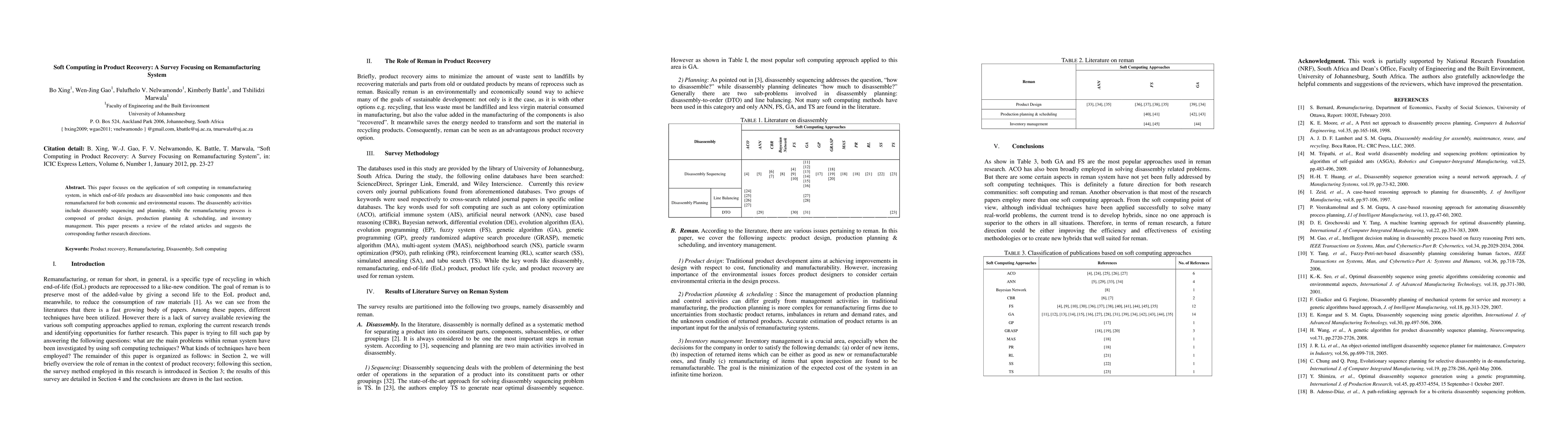 This paper focuses on the application of soft computing in remanufacturing system, in which end-of-life products are disassembled into basic components and then remanufactured for both economic and environmental reasons. The disassembly activities include disassembly sequencing and planning, while the remanufacturing process is composed of product design, production planning & scheduling, and inventory management. This paper presents a review of the related articles and suggests the corresponding further research directions.