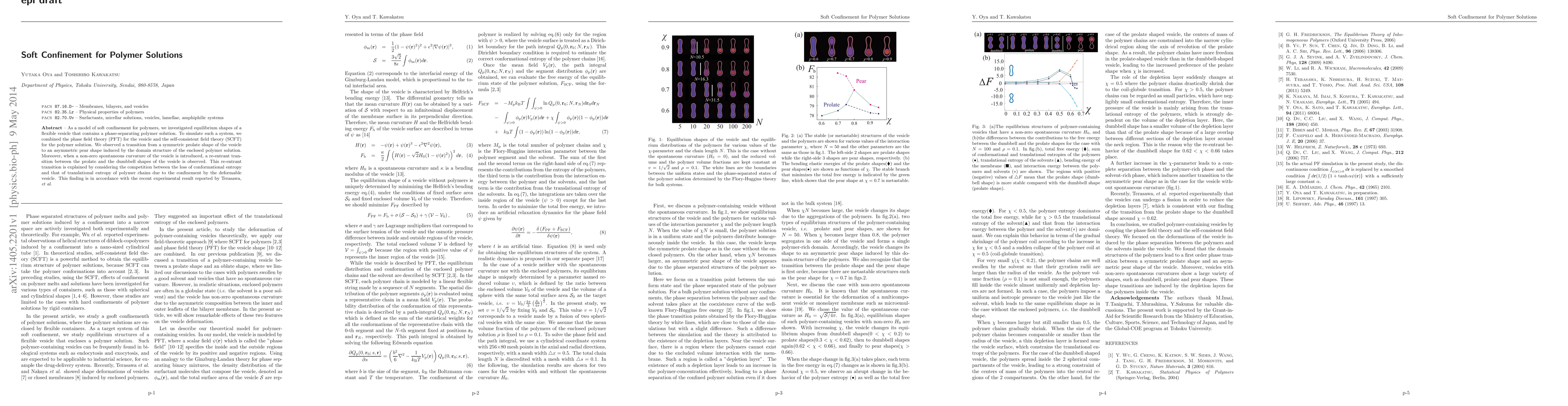 As a model of soft confinement for polymers, we investigated equilibrium shapes of a flexible vesicle that contains a phase-separating polymer solution. To simulate such a system, we combined the phase field theory (PFT) for the vesicle and the self-consistent field theory (SCFT) for the polymer solution. We observed a transition from a symmetric prolate shape of the vesicle to an asymmetric pear shape induced by the domain structure of the enclosed polymer solution. Moreover, when a non-zero spontaneous curvature of the vesicle is introduced, a re-entrant transition between the prolate and the dumbbell shapes of the vesicle is observed. This re-entrant transition is explained by considering the competition between the loss of conformational entropy and that of translational entropy of polymer chains due to the confinement by the deformable vesicle. This finding is in accordance with the recent experimental result reported by Terasawa, et al.