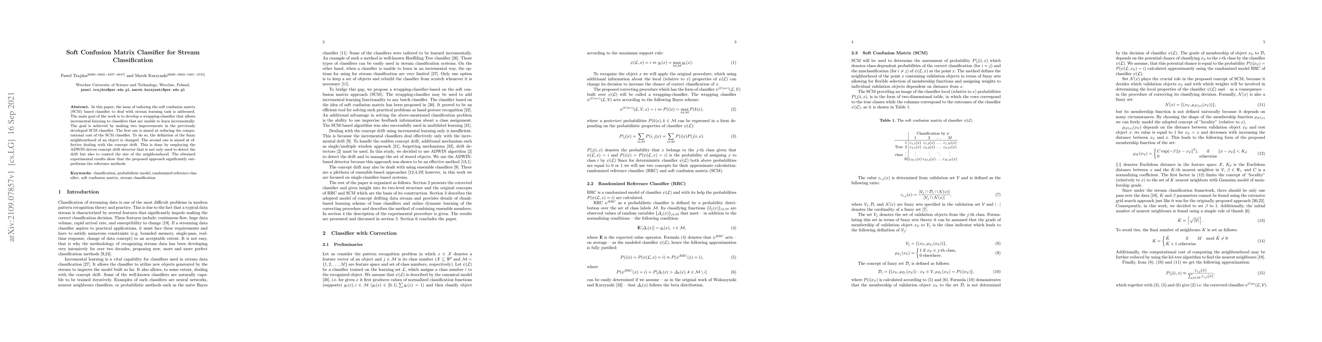 In this paper, the issue of tailoring the soft confusion matrix (SCM) based classifier to deal with stream learning task is addressed. The main goal of the work is to develop a wrapping-classifier that allows incremental learning to classifiers that are unable to learn incrementally. The goal is achieved by making two improvements in the previously developed SCM classifier. The first one is aimed at reducing the computational cost of the SCM classifier. To do so, the definition of the fuzzy neighborhood of an object is changed. The second one is aimed at effective dealing with the concept drift. This is done by employing the ADWIN-driven concept drift detector that is not only used to detect the drift but also to control the size of the neighbourhood. The obtained experimental results show that the proposed approach significantly outperforms the reference methods.