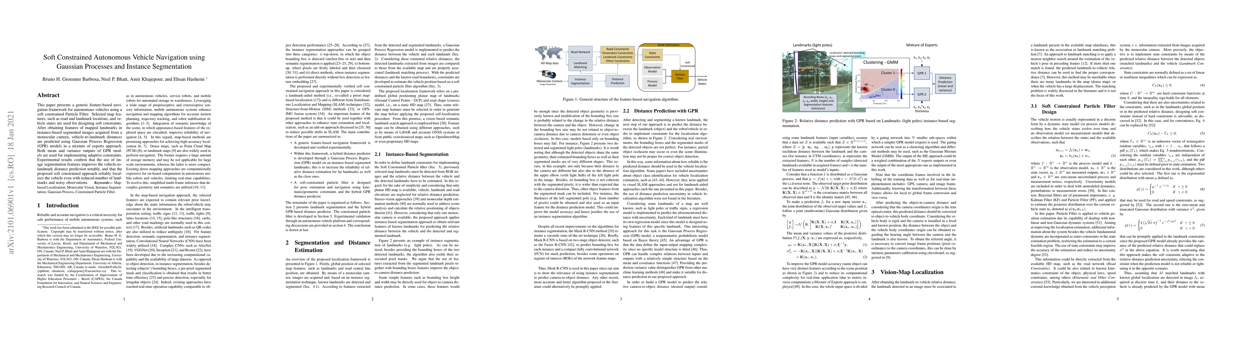 This paper presents a generic feature-based navigation framework for autonomous vehicles using a soft constrained Particle Filter. Selected map features, such as road and landmark locations, and vehicle states are used for designing soft constraints. After obtaining features of mapped landmarks in instance-based segmented images acquired from a monocular camera, vehicle-to-landmark distances are predicted using Gaussian Process Regression (GPR) models in a mixture of experts approach. Both mean and variance outputs of GPR models are used for implementing adaptive constraints. Experimental results confirm that the use of image segmentation features improves the vehicle-to-landmark distance prediction notably, and that the proposed soft constrained approach reliably localizes the vehicle even with reduced number of landmarks and noisy observations.