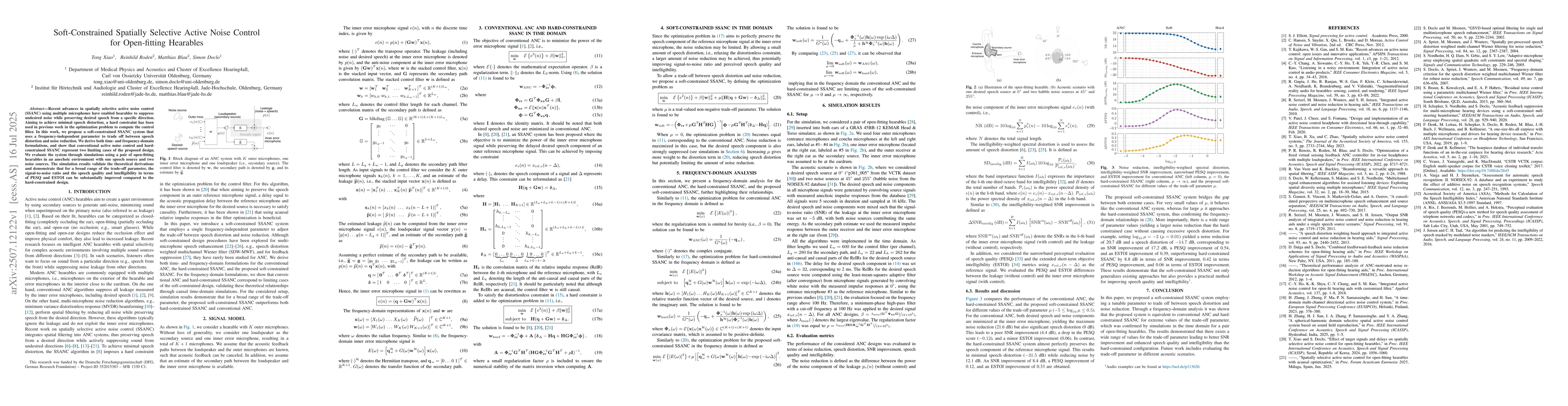 Recent advances in spatially selective active noise control (SSANC) using multiple microphones have enabled hearables to suppress undesired noise while preserving desired speech from a specific direction. Aiming to achieve minimal speech distortion, a hard constraint has been used in previous work in the optimization problem to compute the control filter. In this work, we propose a soft-constrained SSANC system that uses a frequency-independent parameter to trade off between speech distortion and noise reduction. We derive both time- and frequency-domain formulations, and show that conventional active noise control and hard-constrained SSANC represent two limiting cases of the proposed design. We evaluate the system through simulations using a pair of open-fitting hearables in an anechoic environment with one speech source and two noise sources. The simulation results validate the theoretical derivations and demonstrate that for a broad range of the trade-off parameter, the signal-to-noise ratio and the speech quality and intelligibility in terms of PESQ and ESTOI can be substantially improved compared to the hard-constrained design.