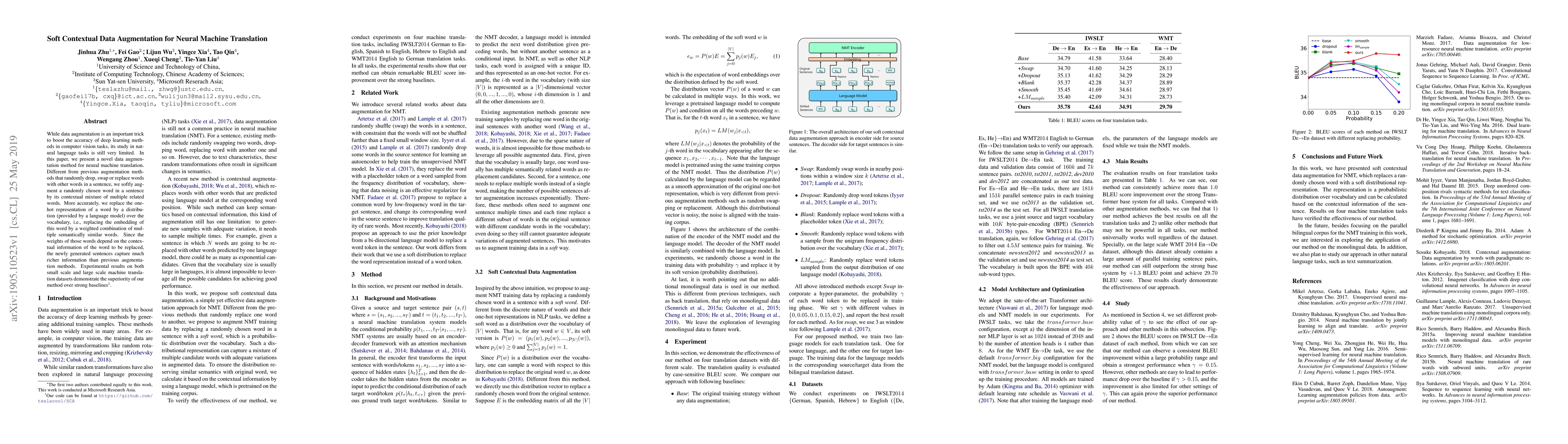 This paper introduces a novel soft contextual data augmentation method for neural machine translation that replaces a word with a weighted combination of contextually relevant words, rather than randomly altering the text. This approach enhances the richness of generated sentences and outperforms traditional augmentation methods, as shown by experimental results on various translation datasets.