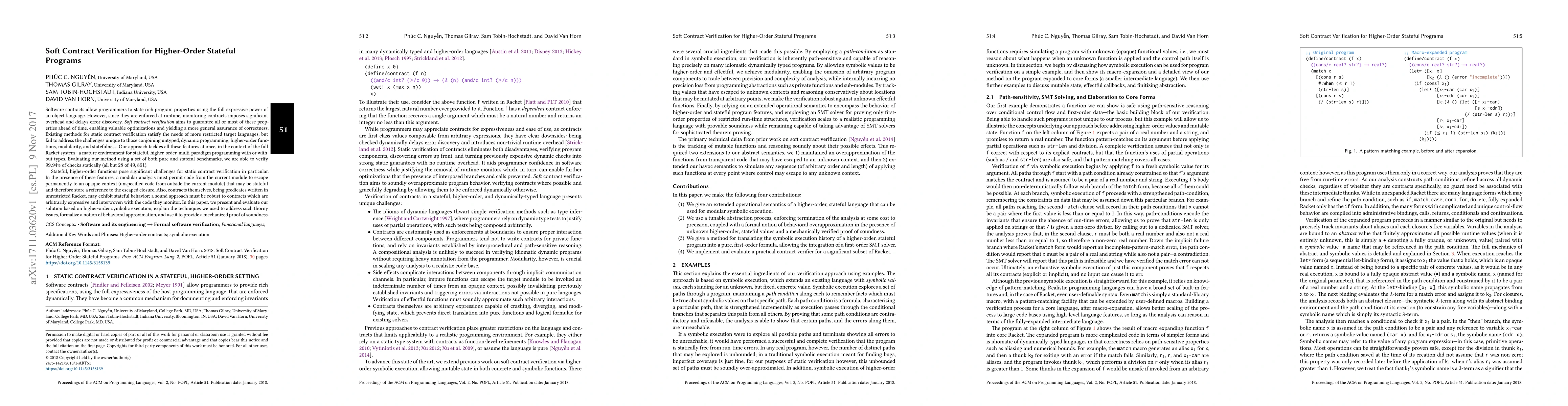 This paper proposes a novel method for soft contract verification in higher-order, stateful Racket programs, addressing challenges posed by dynamic features, higher-order functions, and modularity. The approach employs higher-order symbolic execution and behavioral approximation to verify 99.94% of contract checks statically, ensuring robust correctness guarantees while minimizing runtime overhead.
