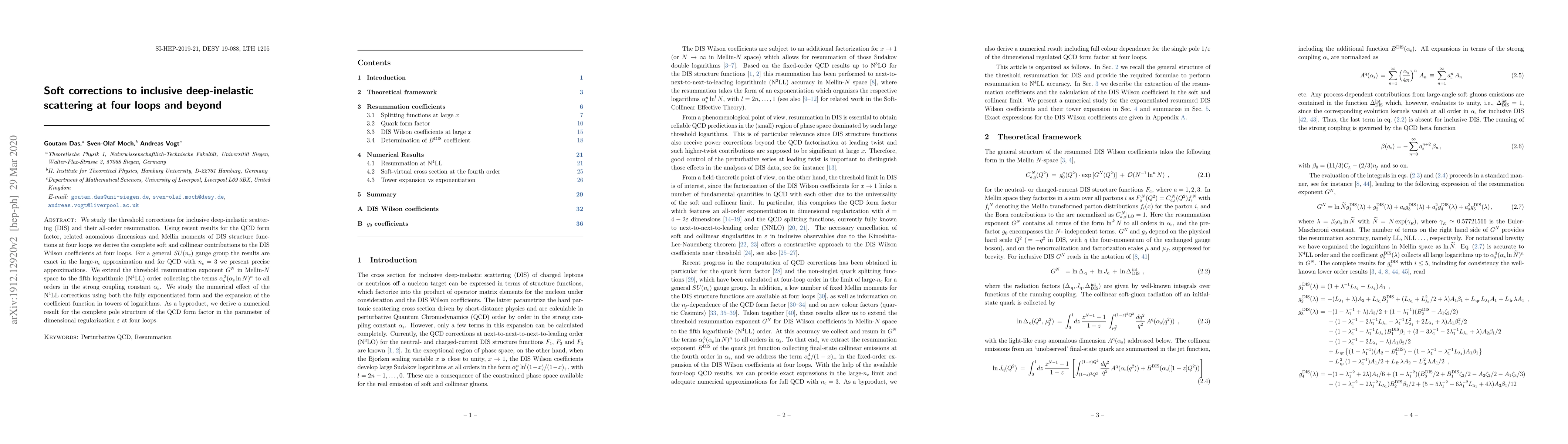 We study the threshold corrections for inclusive deep-inelastic scattering (DIS) and their all-order resummation. Using recent results for the QCD form factor, related anomalous dimensions and Mellin moments of DIS structure functions at four loops we derive the complete soft and collinear contributions to the DIS Wilson coefficients at four loops. For a general $SU(n_c)$ gauge group the results are exact in the large-$n_c$ approximation and for QCD with $n_c=3$ we present precise approximations. We extend the threshold resummation exponent $G^N$ in Mellin-$N$ space to the fifth logarithmic (N$^4$LL) order collecting the terms $\alpha_{\rm s}^{\,3} (\alpha_{\rm s} \ln N)^n$ to all orders in the strong coupling constant $\alpha_{\rm s}$. We study the numerical effect of the N$^4$LL corrections using both the fully exponentiated form and the expansion of the coefficient function in towers of logarithms. As a byproduct, we derive a numerical result for the complete pole structure of the QCD form factor in the parameter of dimensional regularization $\varepsilon$ at four loops.