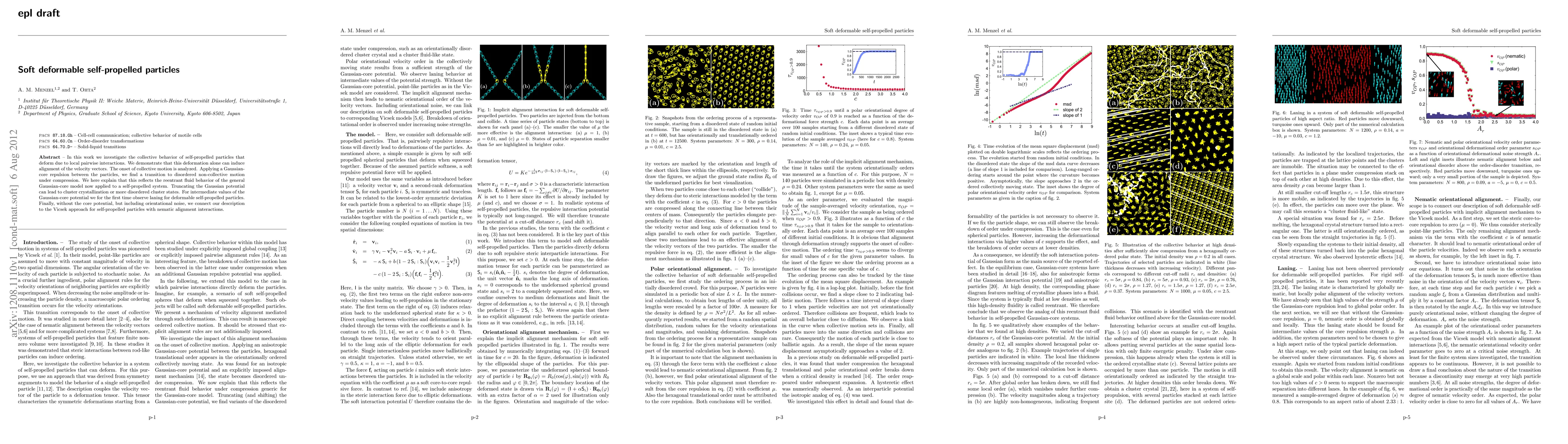 This paper explores the collective dynamics of deformable self-propelled particles influenced by local interactions, revealing alignment induced by deformation and the transition to disordered motion under compression. It identifies laning behavior for intermediate potential values and connects the findings to the Vicsek model for nematic alignment.