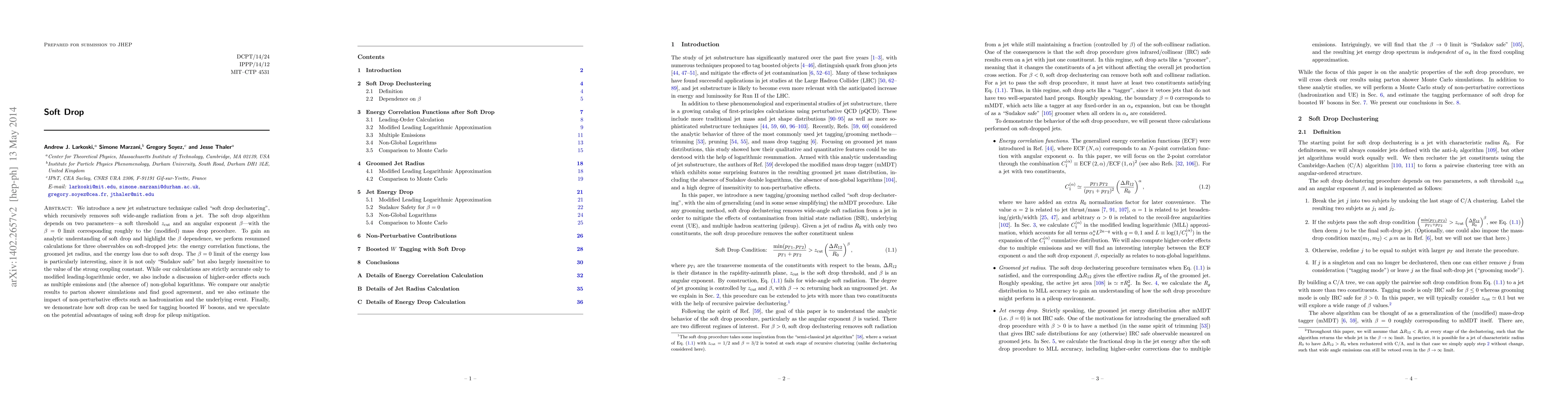 The paper introduces "soft drop declustering," a new jet substructure technique that removes soft radiation from jets, and analyzes its $\beta$ dependence through resummed calculations. The method shows promise for tagging boosted W bosons and mitigating pileup effects.