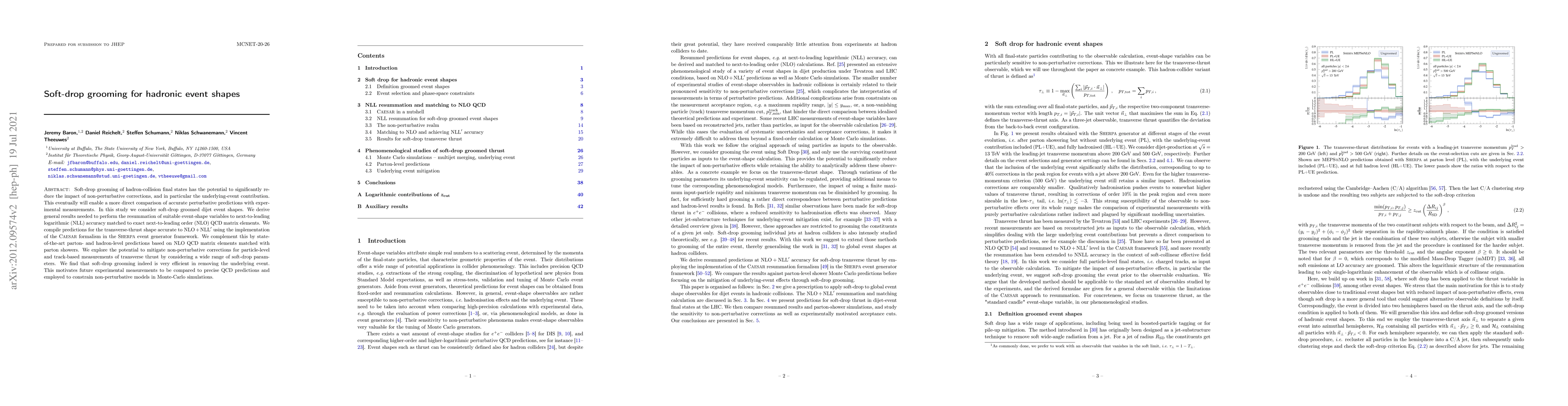 This paper explores the use of soft-drop grooming to reduce non-perturbative corrections in hadron-collision final states, particularly the underlying event. It presents results for the transverse-thrust shape at NLO+NLL accuracy and demonstrates the effectiveness of soft-drop grooming in mitigating these corrections, suggesting its potential for future experimental comparisons and model constraints.