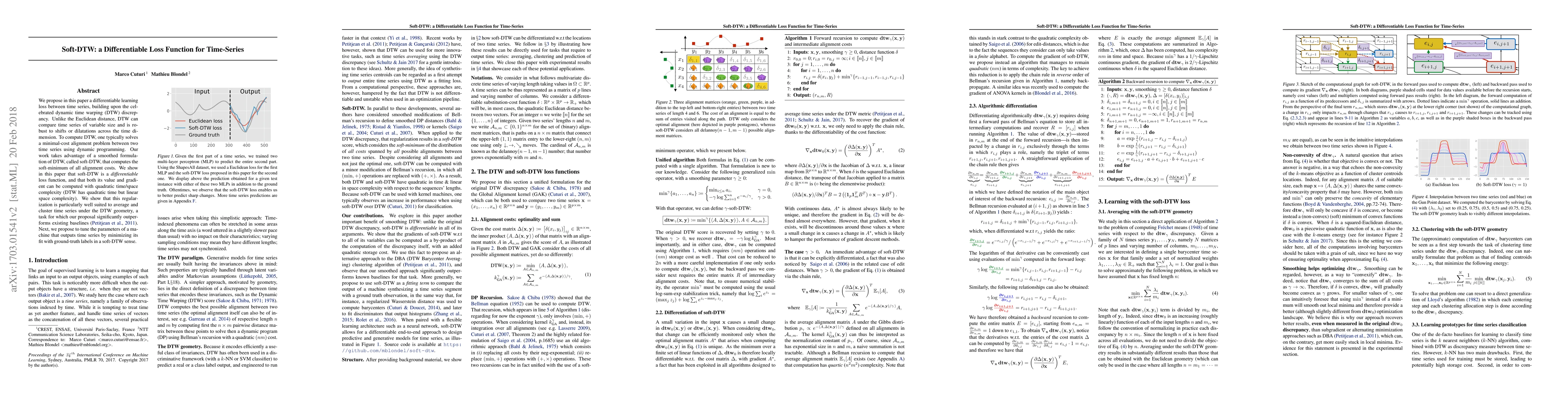 This paper introduces soft-DTW, a differentiable loss function based on the dynamic time warping (DTW) method, which allows for robust comparison of time series of varying lengths and is resilient to time shifts and dilations. The authors demonstrate that soft-DTW's value and gradient can be computed efficiently, and it outperforms existing methods for clustering and averaging time series.