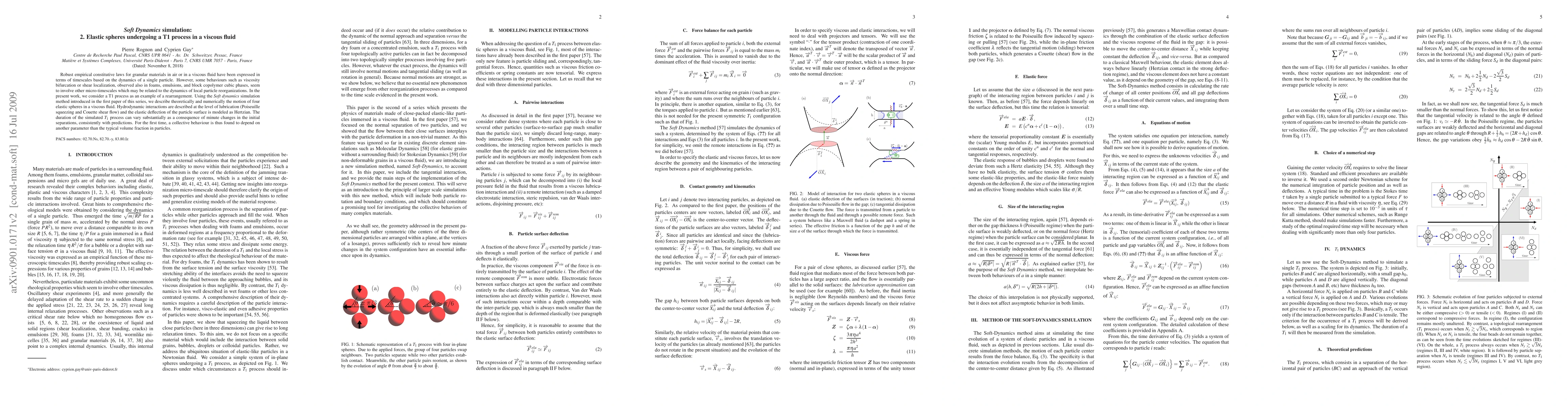 Robust empirical constitutive laws for granular materials in air or in a viscous fluid have been expressed in terms of timescales based on the dynamics of a single particle. However, some behaviours such as viscosity bifurcation or shear localization, observed also in foams, emulsions, and block copolymer cubic phases, seem to involve other micro-timescales which may be related to the dynamics of local particle reorganizations. In the present work, we consider a T1 process as an example of a rearrangement. Using the Soft dynamics simulation method introduced in the first paper of this series, we describe theoretically and numerically the motion of four elastic spheres in a viscous fluid. Hydrodynamic interactions are described at the level of lubrication (Poiseuille squeezing and Couette shear flow) and the elastic deflection of the particle surface is modeled as Hertzian. The duration of the simulated T1 process can vary substantially as a consequence of minute changes in the initial separations, consistently with predictions. For the first time, a collective behaviour is thus found to depend on another parameter than the typical volume fraction in particles.