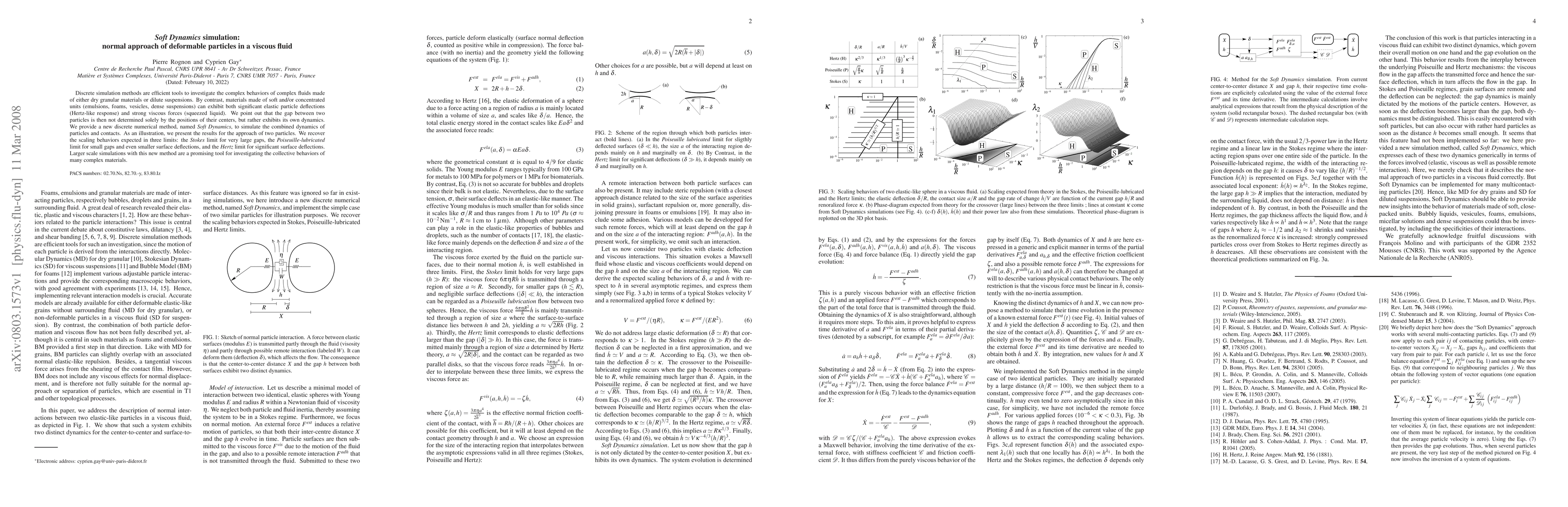 Discrete simulation methods are efficient tools to investigate the complex behaviors of complex fluids made of either dry granular materials or dilute suspensions. By contrast, materials made of soft and/or concentrated units (emulsions, foams, vesicles, dense suspensions) can exhibit both significant elastic particle deflections (Hertz-like response) and strong viscous forces (squeezed liquid). We point out that the gap between two particles is then not determined solely by the positions of their centers, but rather exhibits its own dynamics. We provide a new discrete numerical method, named Soft Dynamics, to simulate the combined dynamics of particles and contacts. As an illustration, we present the results for the approach of two particles. We recover the scaling behaviors expected in three limits: the Stokes limit for very large gaps, the Poiseuille-lubricated limit for small gaps and even smaller surface deflections, and the Hertz limit for significant surface deflections. Larger scale simulations with this new method are a promising tool for investigating the collective behaviors of many complex materials.