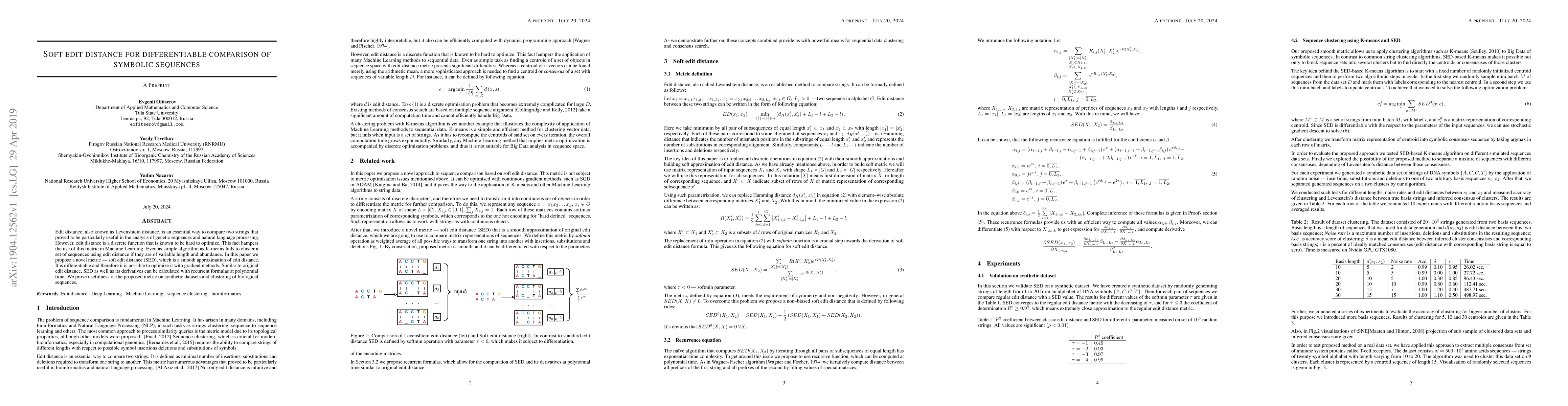 This paper introduces soft edit distance (SED), a differentiable approximation of traditional edit distance, enabling optimization via gradient methods. It is shown to be effective for clustering variable-length sequences in applications like genetic analysis and natural language processing.