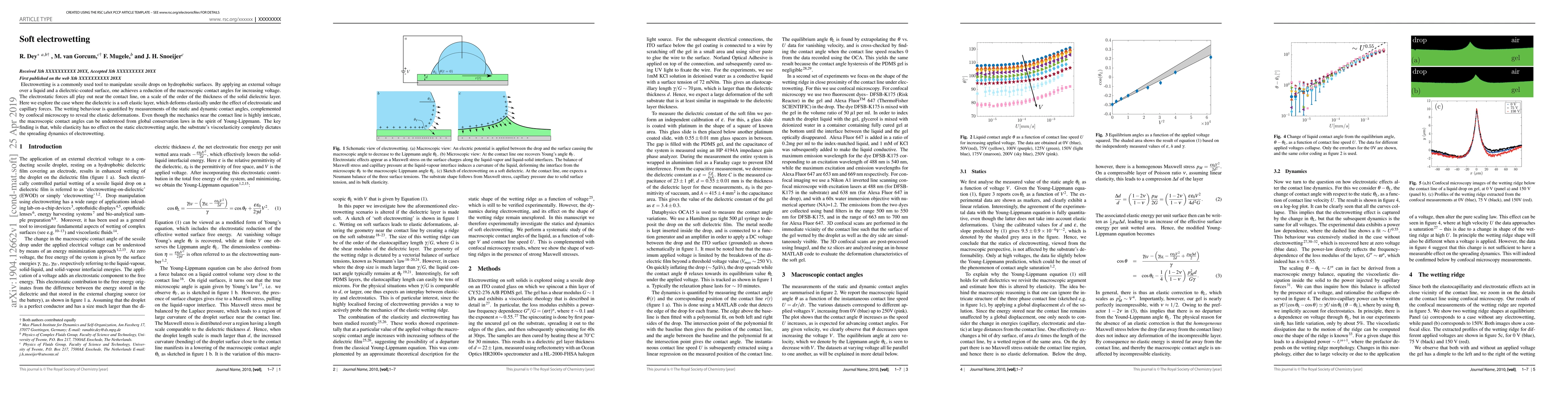 This research explores soft electrowetting on elastic dielectric layers, finding that while static contact angles remain unaffected by elasticity, the substrate's viscoelastic properties significantly influence the dynamic spreading behavior of electrowetting. Confocal microscopy reveals the elastic deformations, and global conservation laws explain macroscopic contact angle changes.