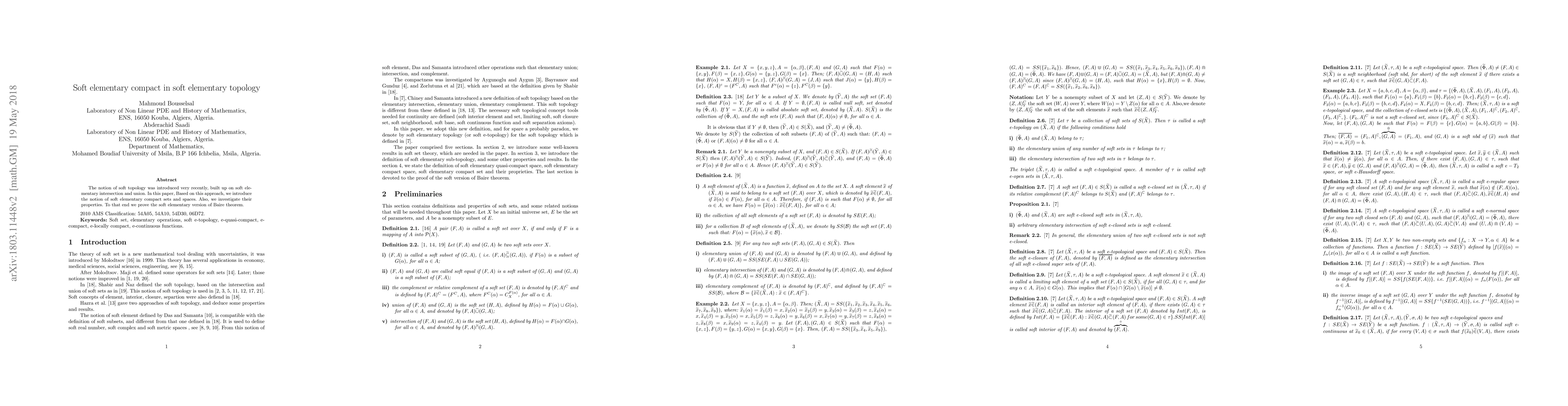 Researchers introduce a definition of soft elementary compact sets and spaces based on soft topology, exploring properties and implications including the soft elementary version of Baire theorem.