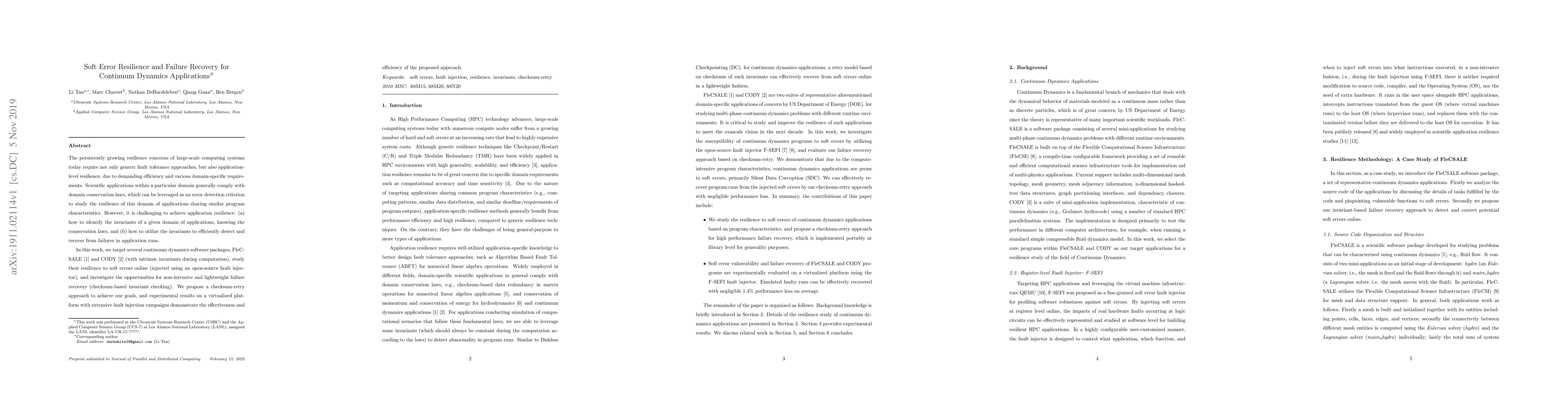 This paper investigates resilience and failure recovery for continuum dynamics applications, focusing on identifying domain-specific invariants and leveraging them for efficient error detection and recovery. The proposed checksum-retry approach is tested on FleCSALE and CODY software, showing effective resilience against soft errors through checksum-based invariant checking.